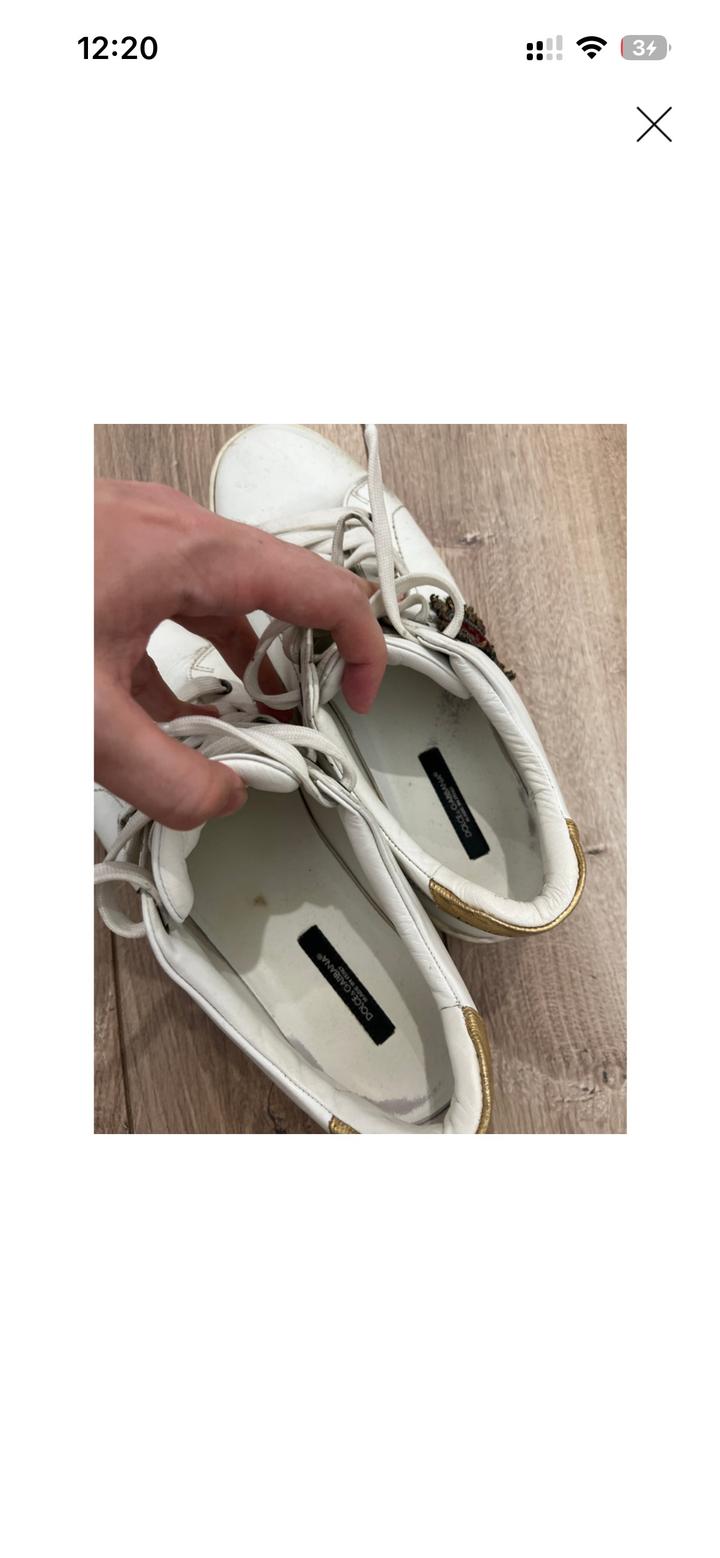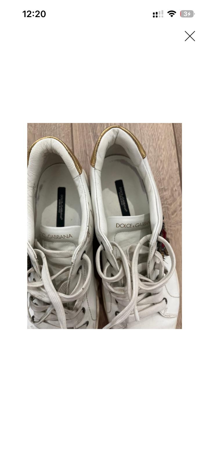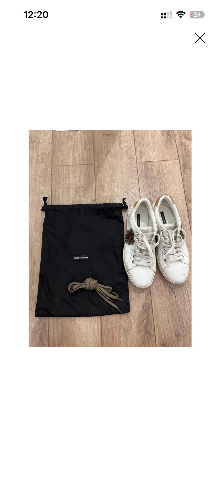 Белые кроссовки Dolce Gabanna, есть свои мешочки, и запасные шнурки. С одной стороны около пятки чуть чуть испачкано чёрной краской. Поэтому цена и дешевая. Артикул: 586648