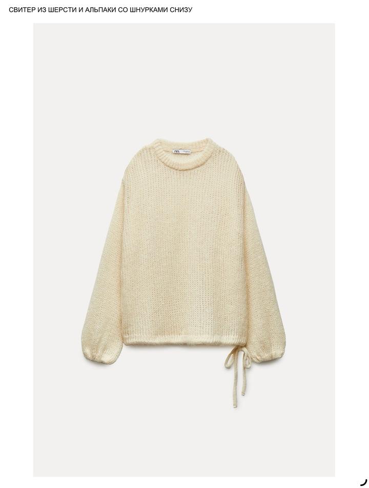 Вязанный свитер от Zara с завязками внизу Материал Альпака и шерсть 100% Состояние: новый с бирками Размер S (большемерит) Артикул: 586771