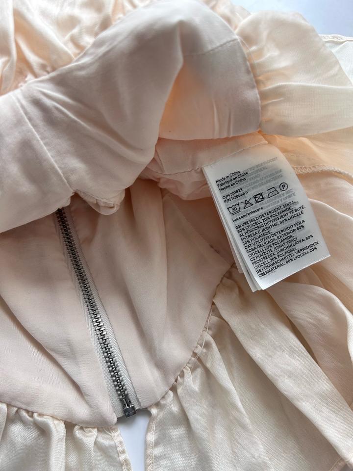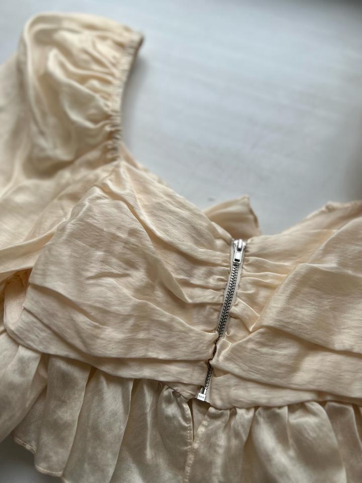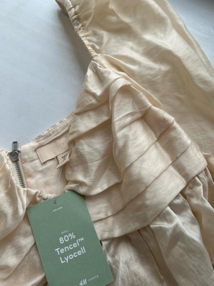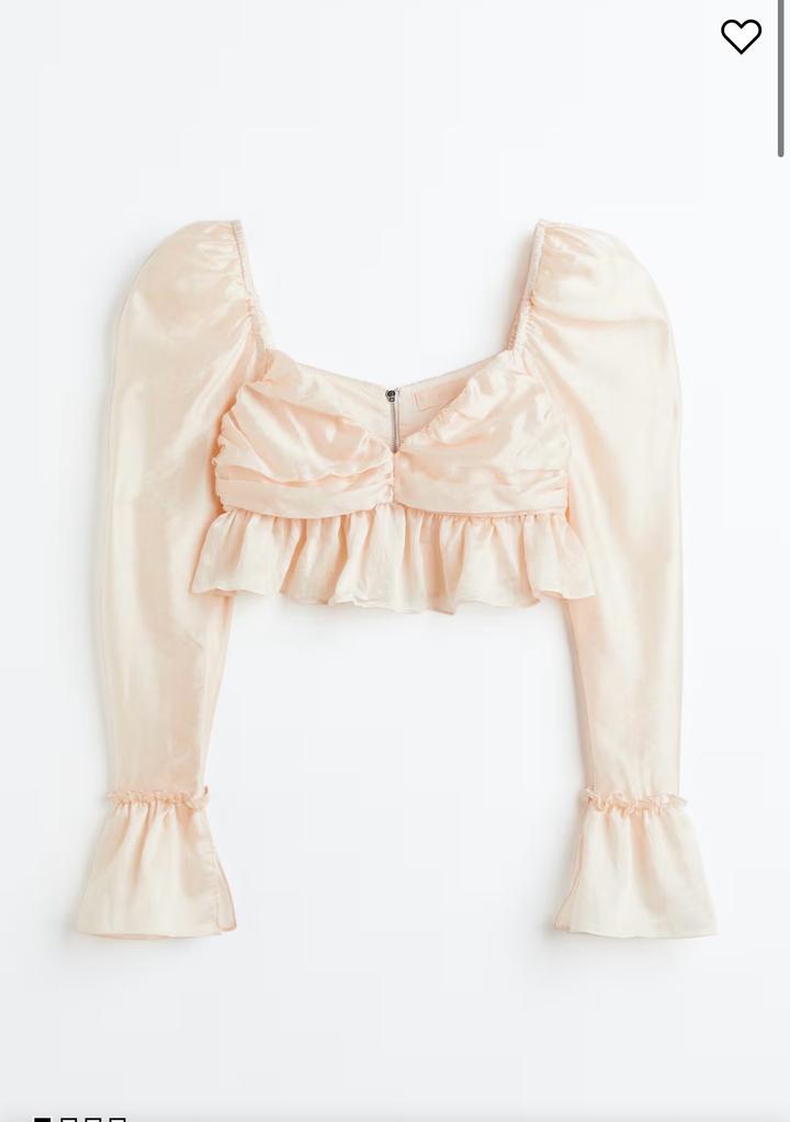 Укороченная блузка из тканой ткани из смеси лиоцелла Tencel™. Вырез в форме сердца и длинные пышные рукава с узкой резинкой на плечах и расклешенные манжетами, состав натуральный 80% лиоцелл. Сидит очень красиво. Увидела на обзоре у стилиста Кати Гуссэ, заказала с Германии. Артикул: 586817
