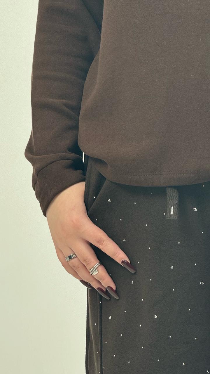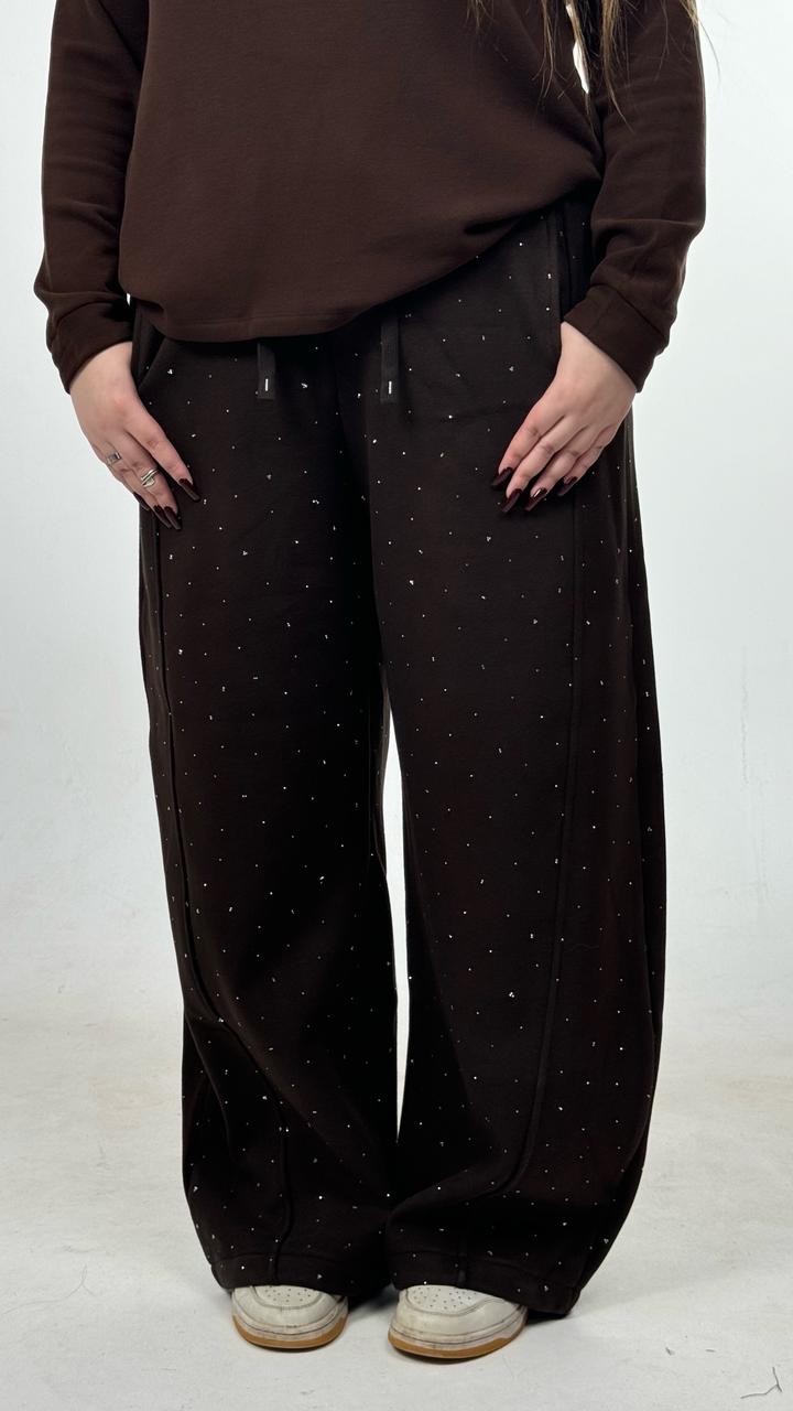 Джоггеры со стразами на мягком утеплении. На высокой посадке с регулируемой кулиской по низу, подходят под любую фигуру. В шоколадном цвете. Размер L. Новый, остаток зимней коллекции. Отличного качества. Артикул: 587119