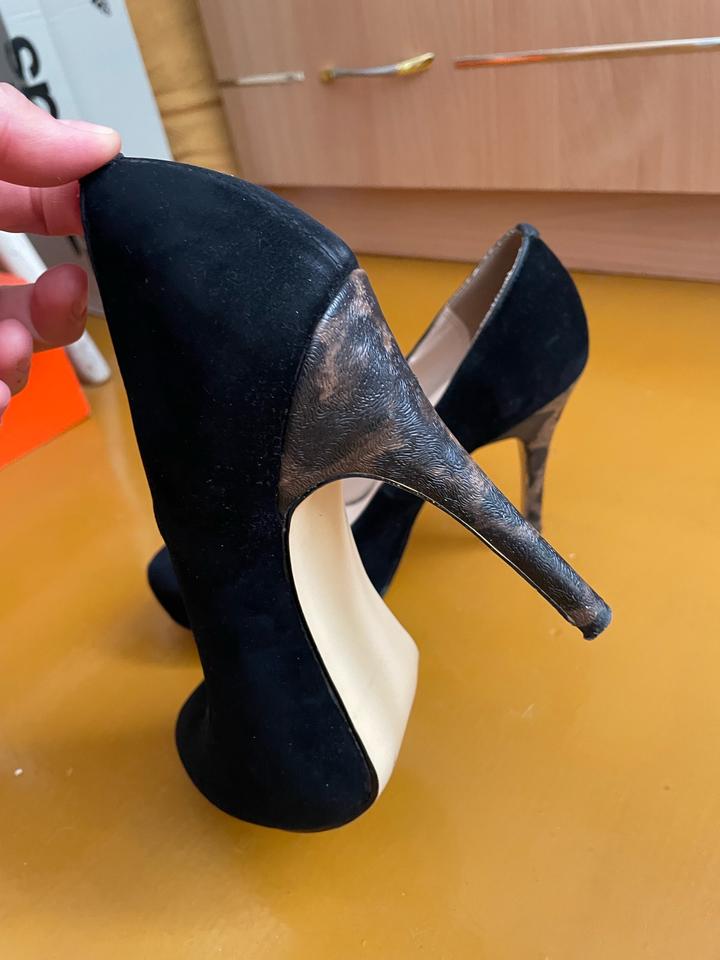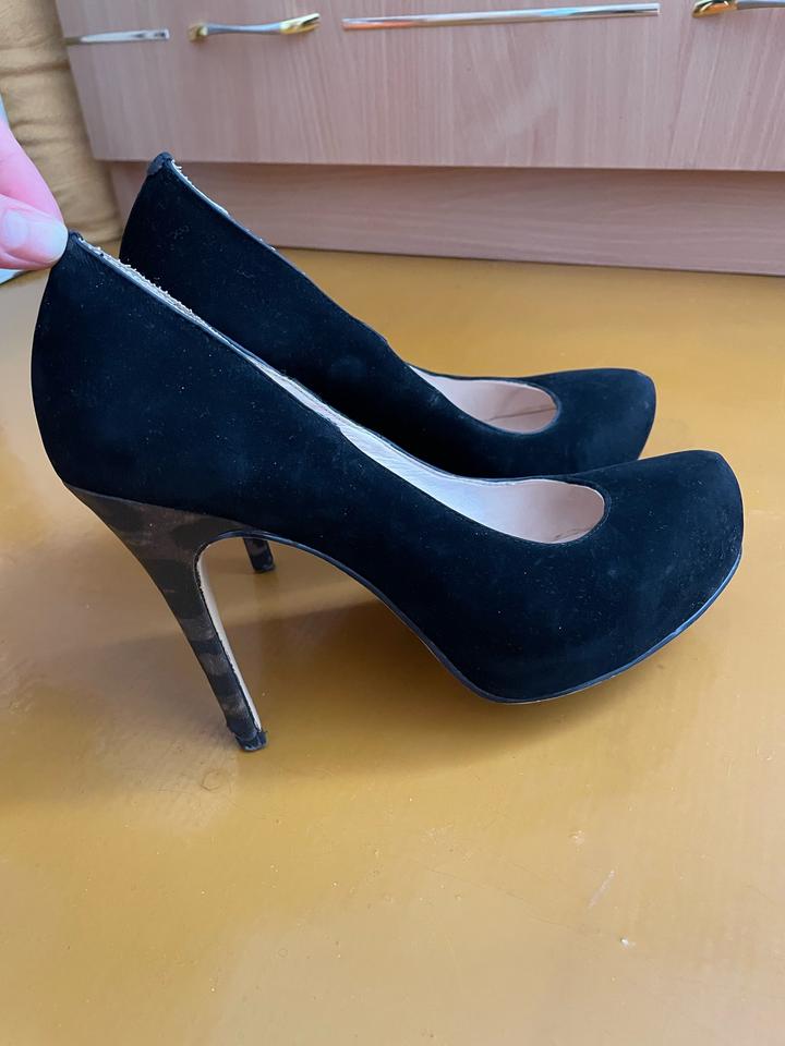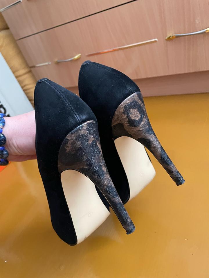Классические туфли-лодочки с небольшой платформой в подносочной части и закругленным носком. Высокий каблук-шпилька. Высота может варьироваться от 10 до 12 см. Каблуки туфель декорированы оригинальной отделкой под леопарда, что придает модели изысканность и оригинальность.Хорошее состояние. Замша в отличном состоянии, без потертостей и повреждений. Каблуки устойчивые, есть дополнительные набойки. Артикул: 587253
