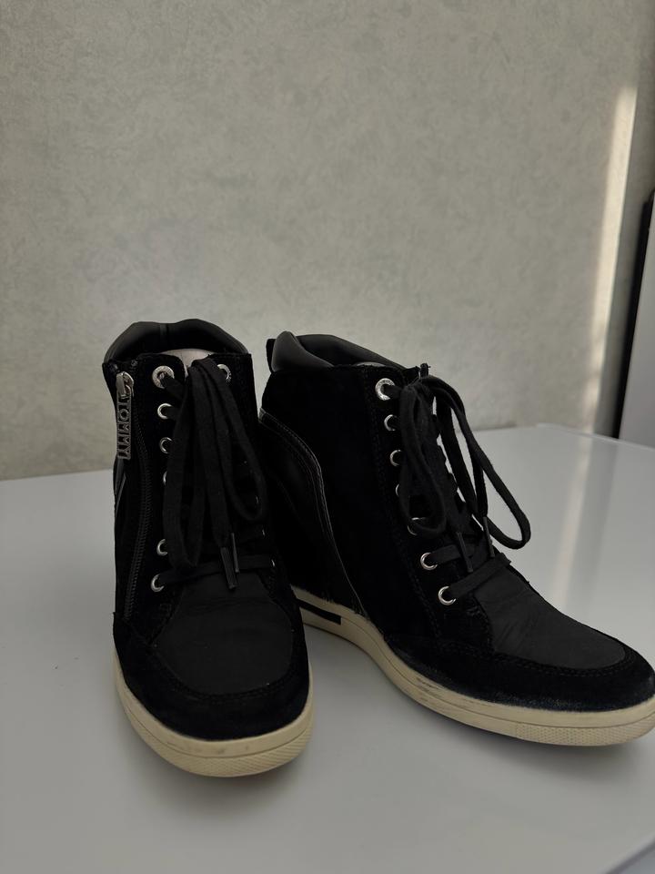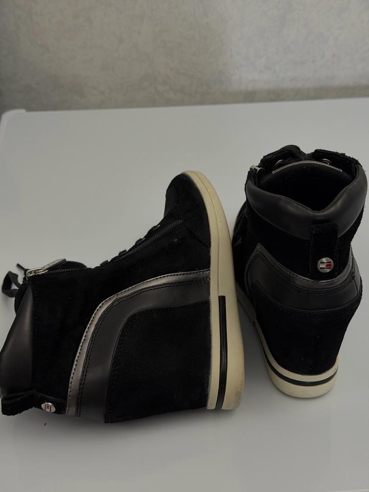 Кеды на танкетке Tommy Hilfiger выполнены из натурально велюра. Детали: текстильная внутренняя отделка, застежка на молнии, шнуровка, резиновая подошва. Артикул: 587443