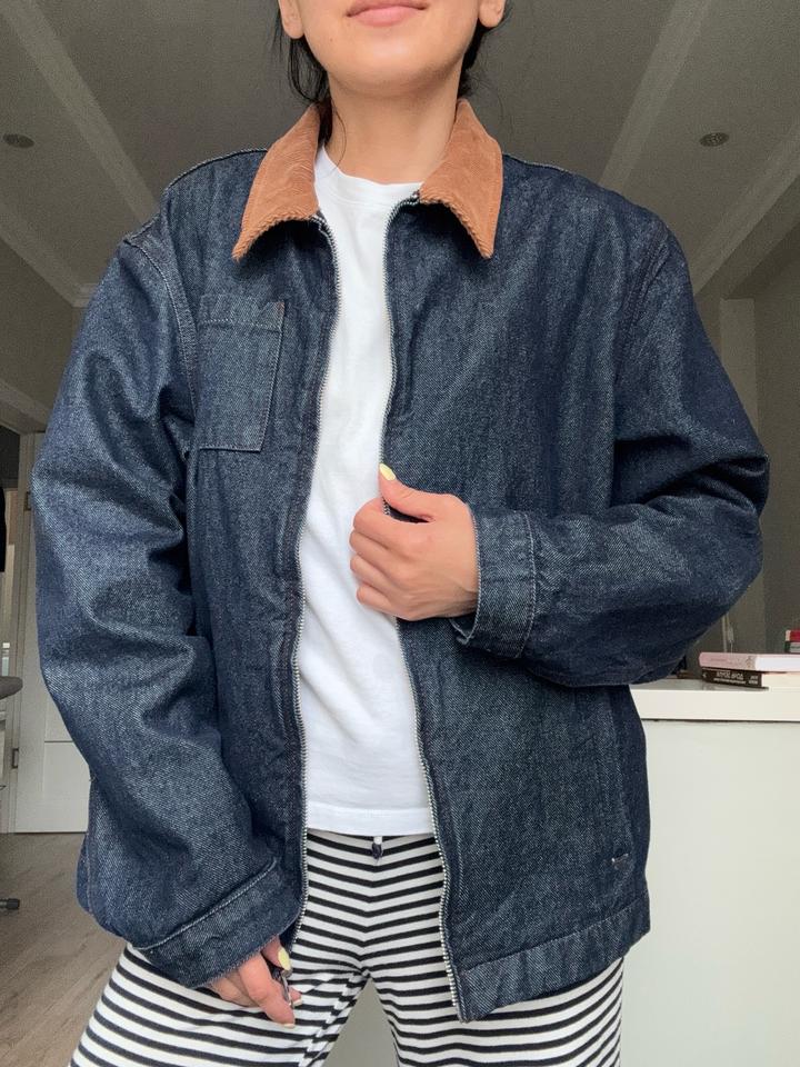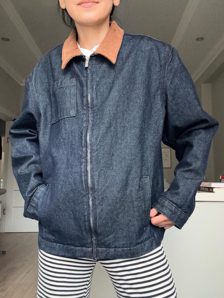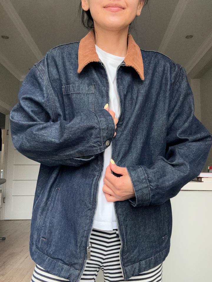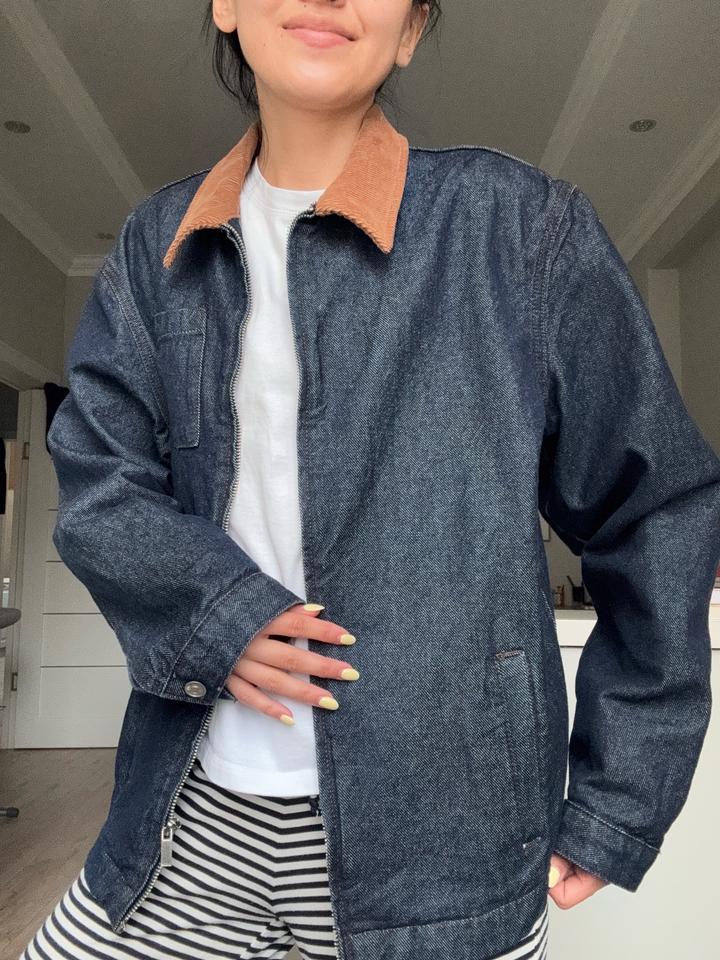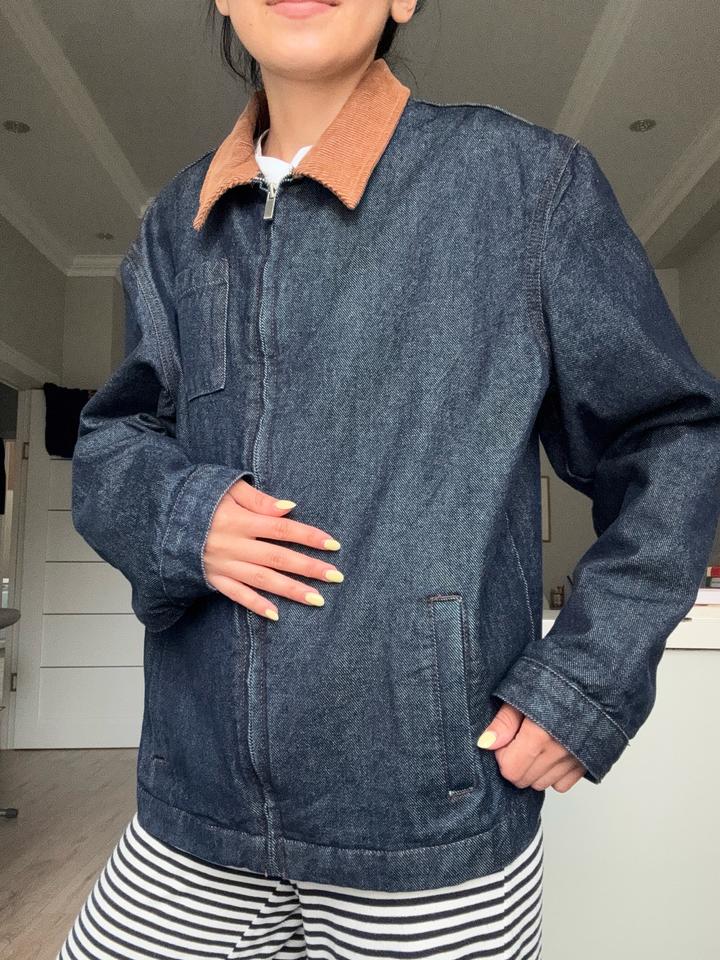 Стильная куртка из плотного денима с контрастным вельветовым воротником. Свободный, слегка oversize крой — идеально садится и легко комбинируется с базовыми вещами. Застёжка на молнии, удобные карманы, минималистичный дизайн. Lime kids 164 - подойдет для XS, S для взрослых. Артикул: 587894