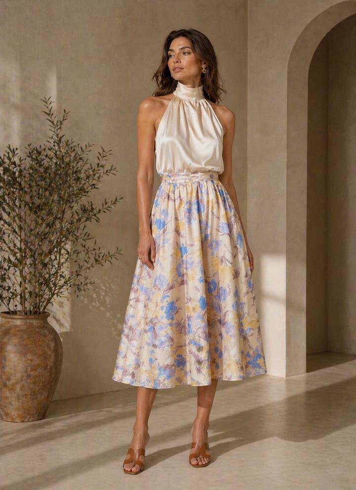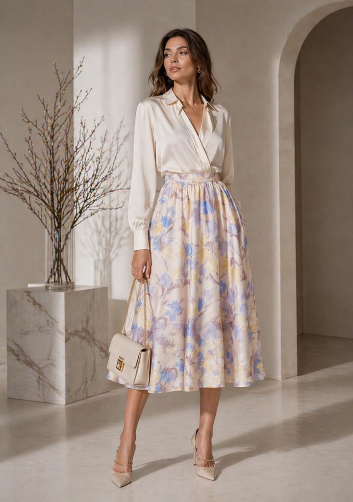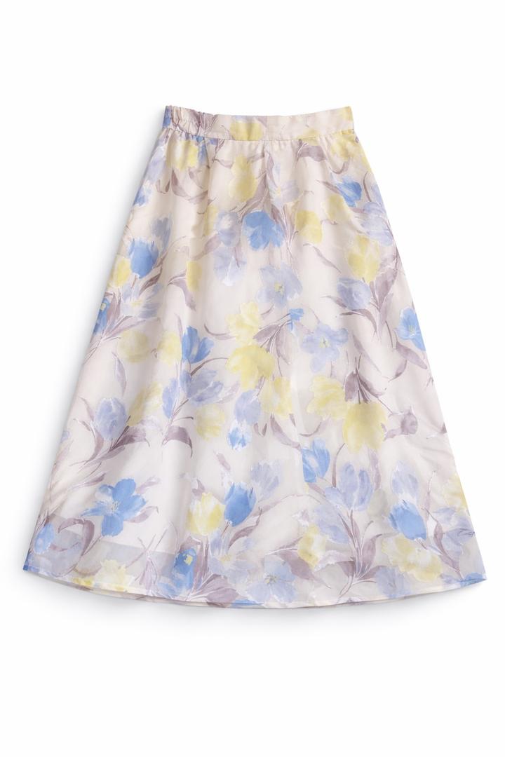 Юбка из воздушной ткани с деликатным цветочным рисунком в пастельной гамме, создающая лёгкое, струящееся движение при каждом шаге. Состояние новой. Артикул: 587905