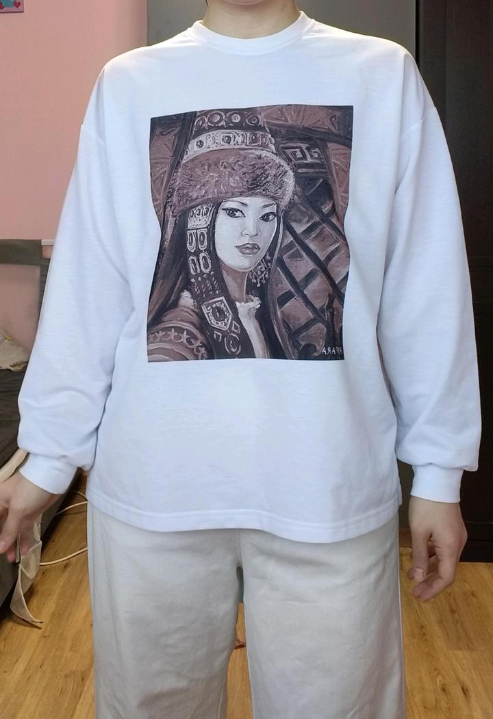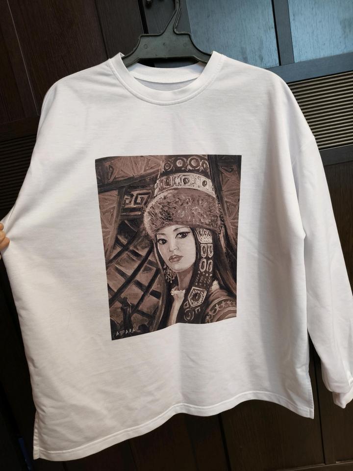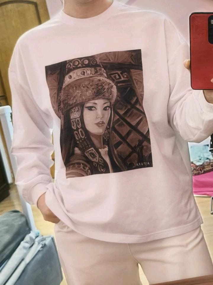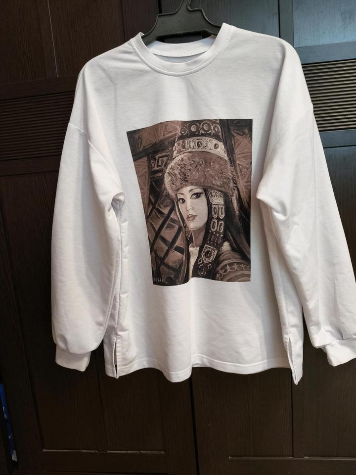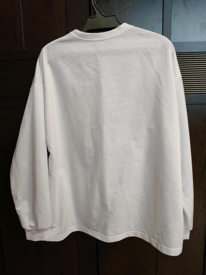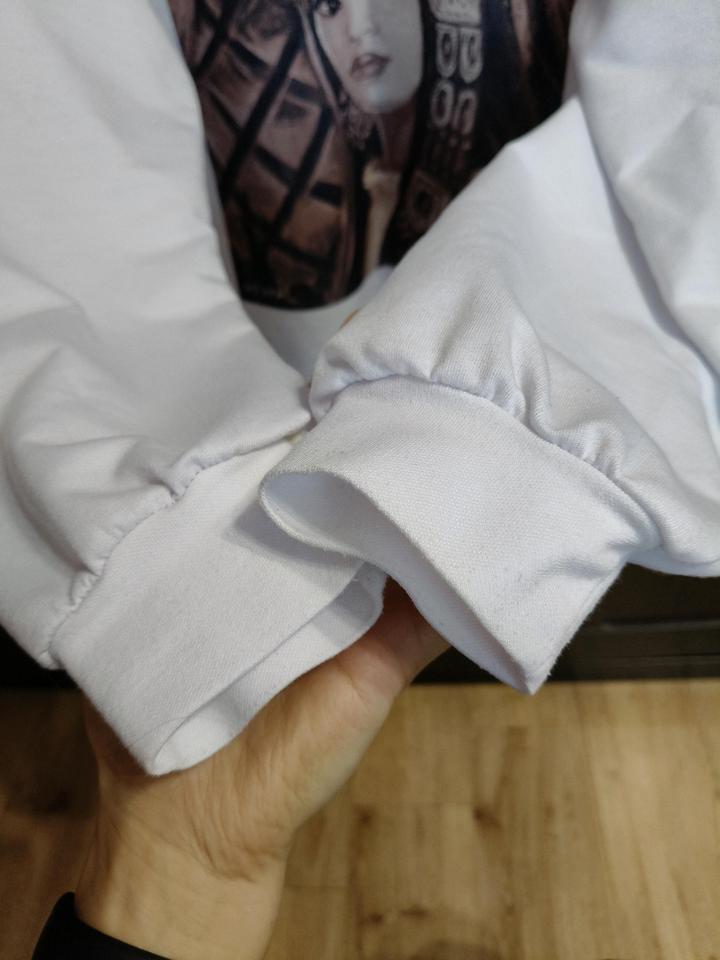 Свитшот мягкий без начёса. Ткань похожа на футер но даже тоньше. Форму держит. Размер подойдет S-М, будет сидеть оверсайз. На фото он на мне, у меня рост 165, вест 58, размер М. Принт не наклейка а прям печать, так что смотрится хорошо, естественно драпируется и не стоит колом, а также не блестит. Артикул: 588467