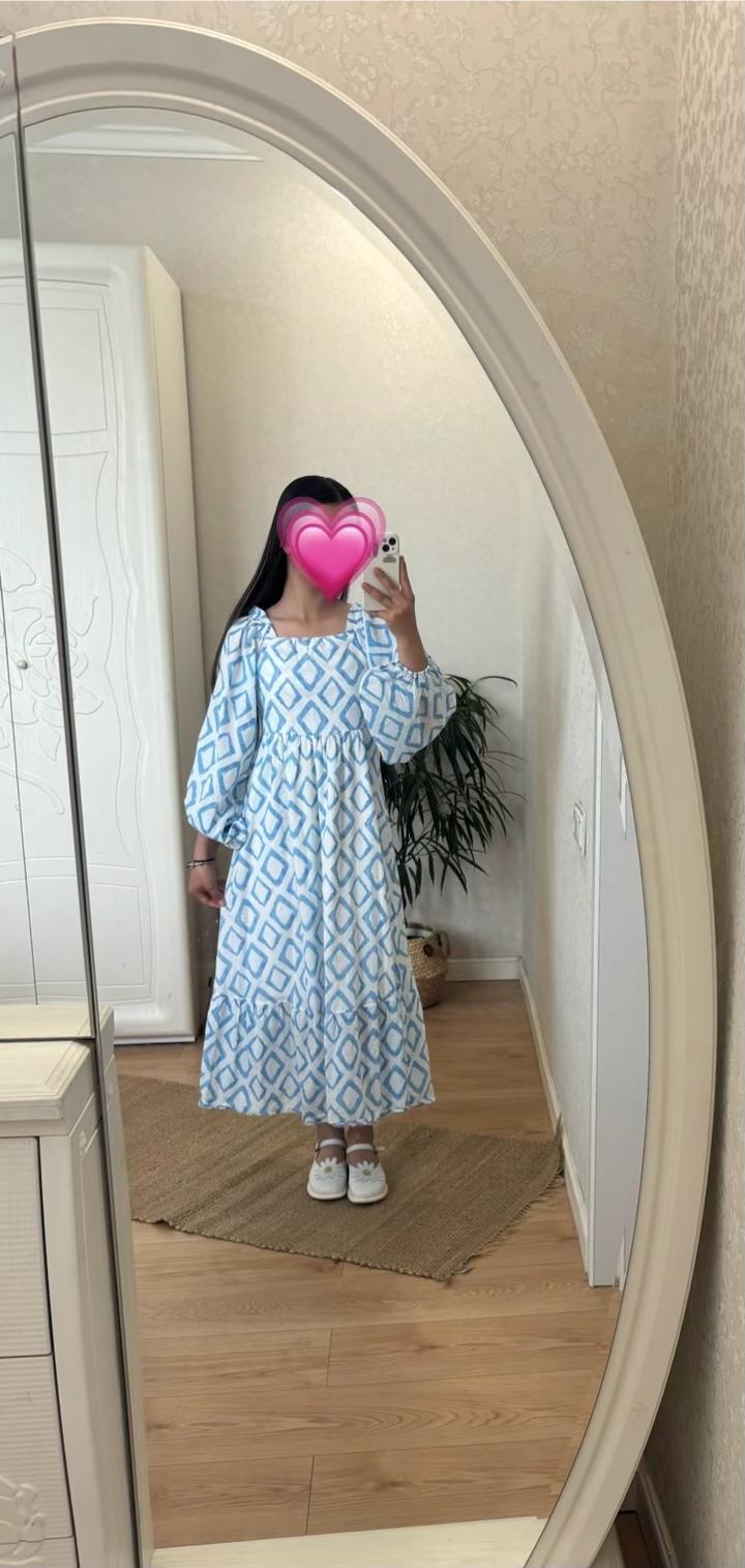 Лёгкое летнее платье в бело-голубом цвете с геометрическим принтом. Свободный крой, удобные рукава на резинке, не сковывает движения. Подойдёт на каждый день или прогулок. Размер: S (примерно 42–44) Состояние: отличное Рост: 150-156 Артикул: 588705