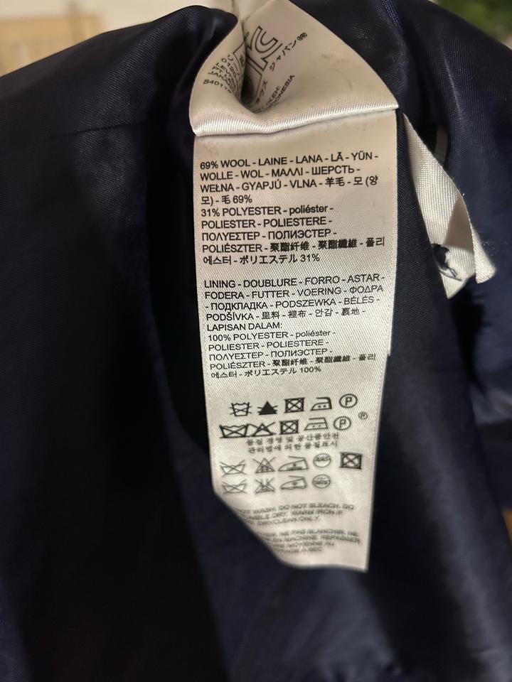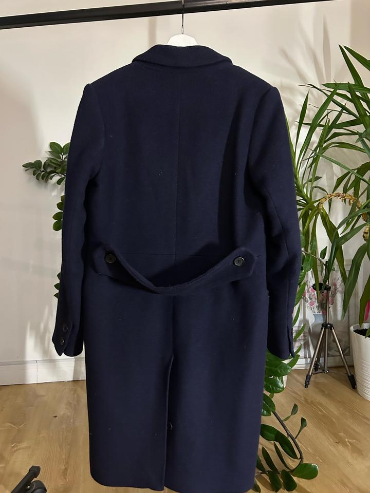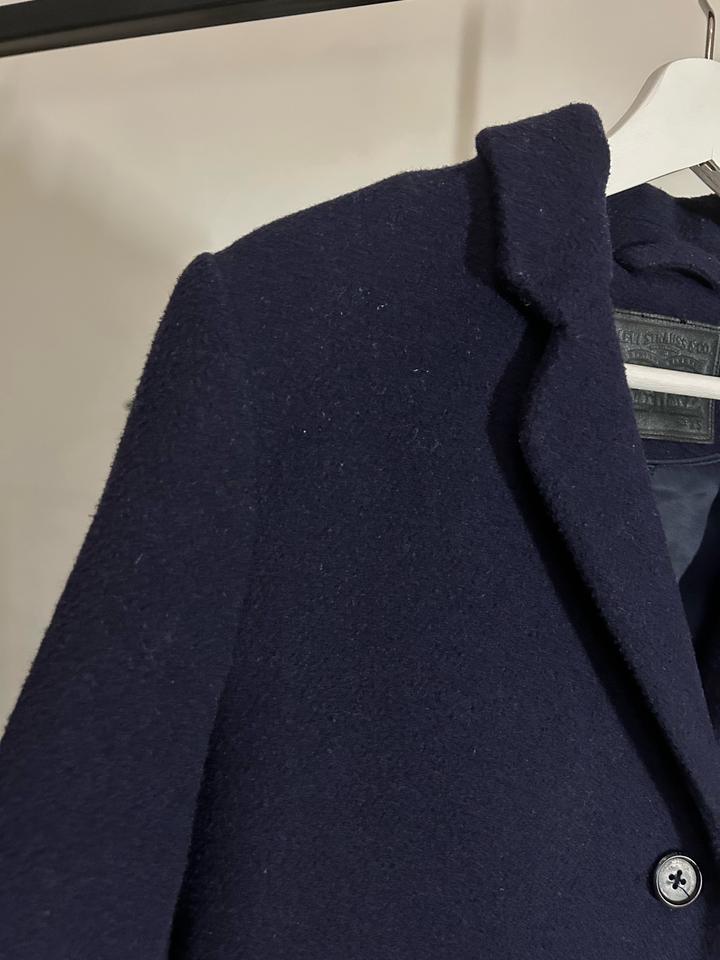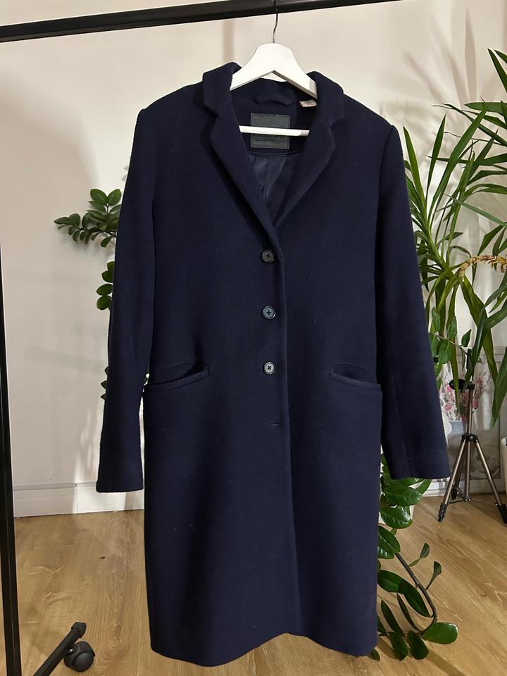 Тёмно-синее шерстяное пальто классического кроя. Однобортное, три пуговицы, два кармана по бокам. Состав: 69% шерсть, 31% полиэстер, подкладка 100% полиэстер. Уход: только химчистка. Артикул: 588733