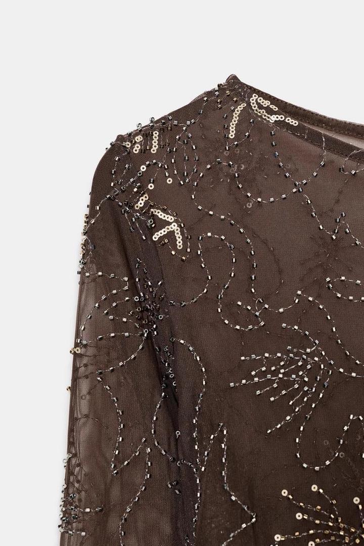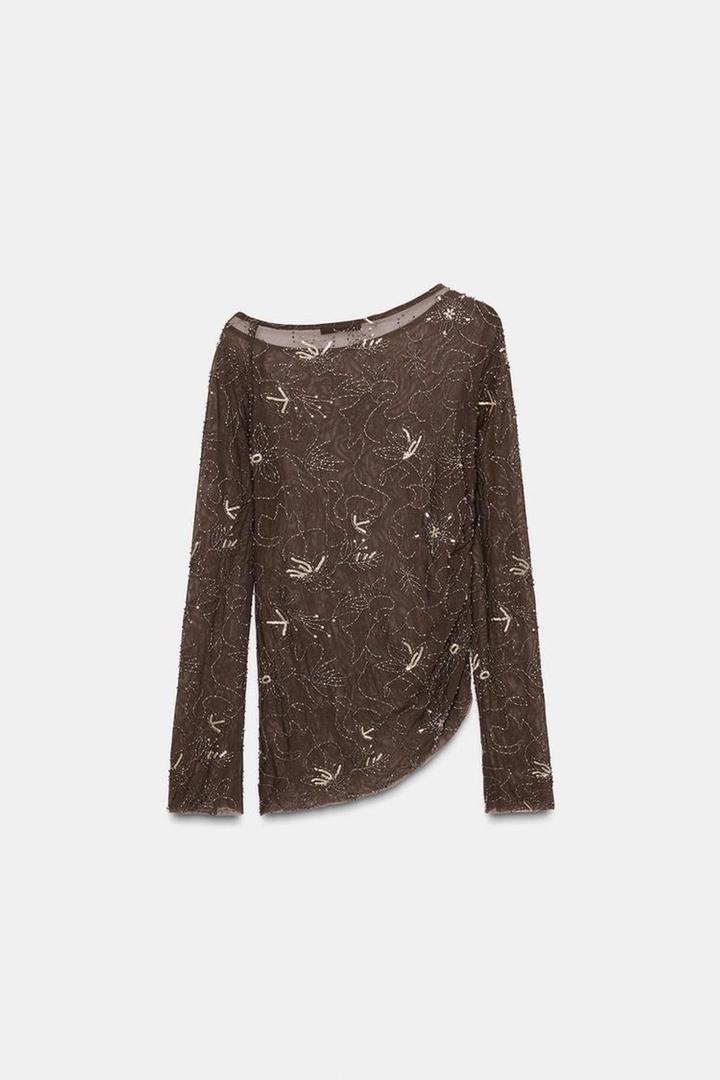 ZARA ТОП ИЗ ПОЛУПРОЗРАЧНОЙ ТКАНИ СО СБОРКАМИ И ВЫШИВКОЙ БИСЕРОМS/M