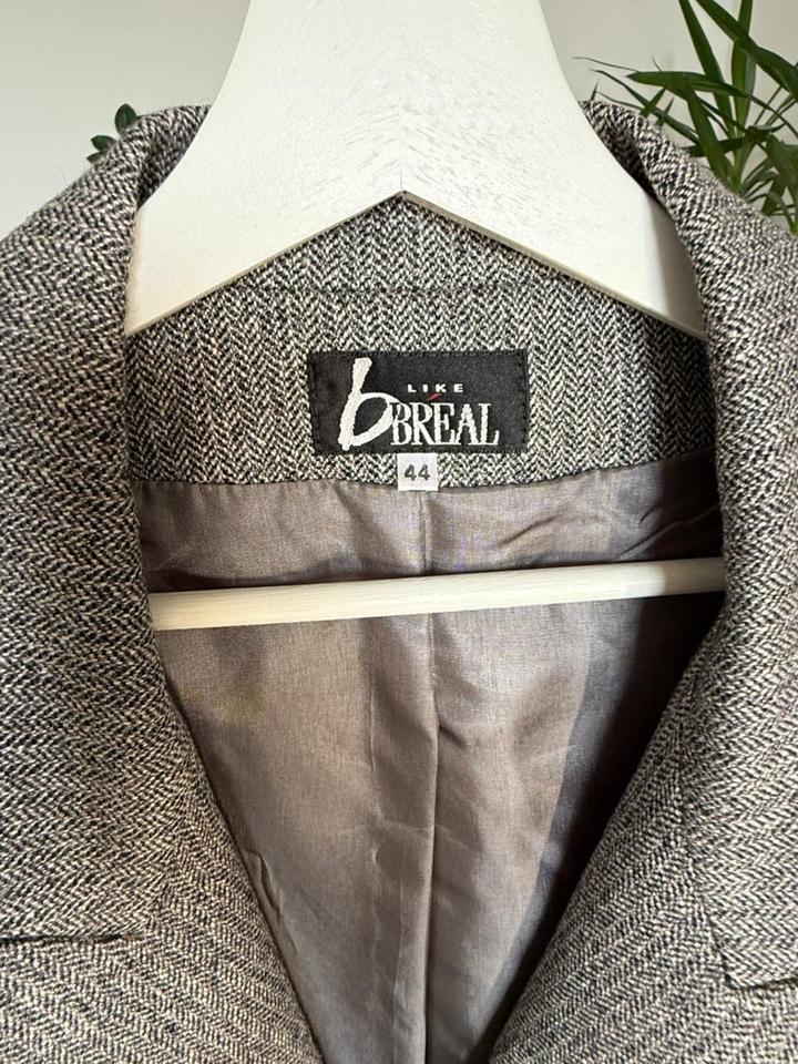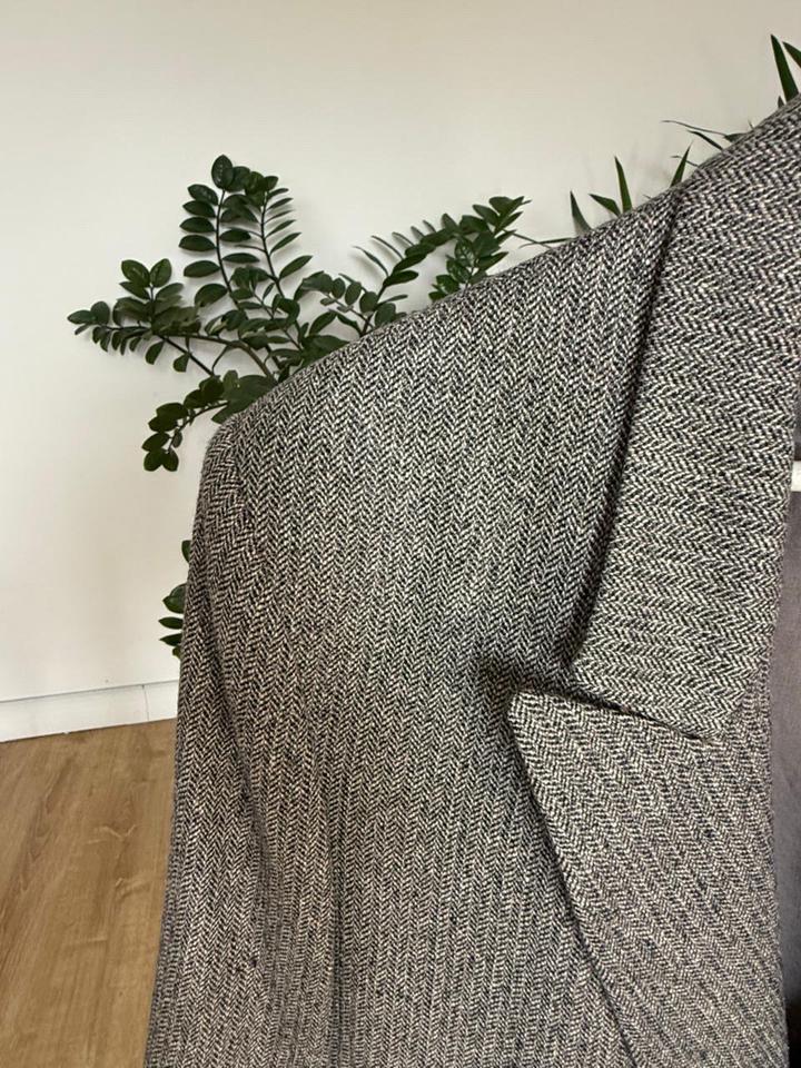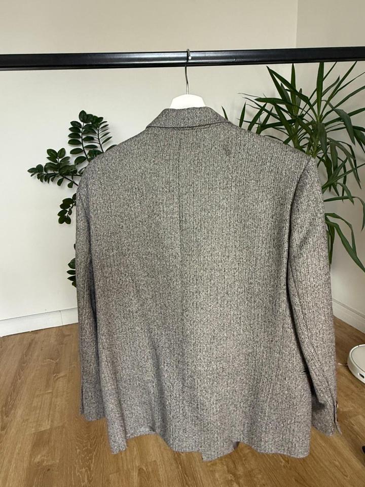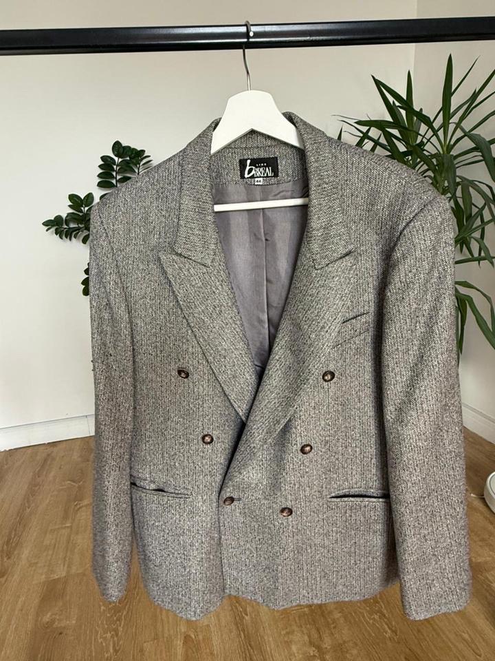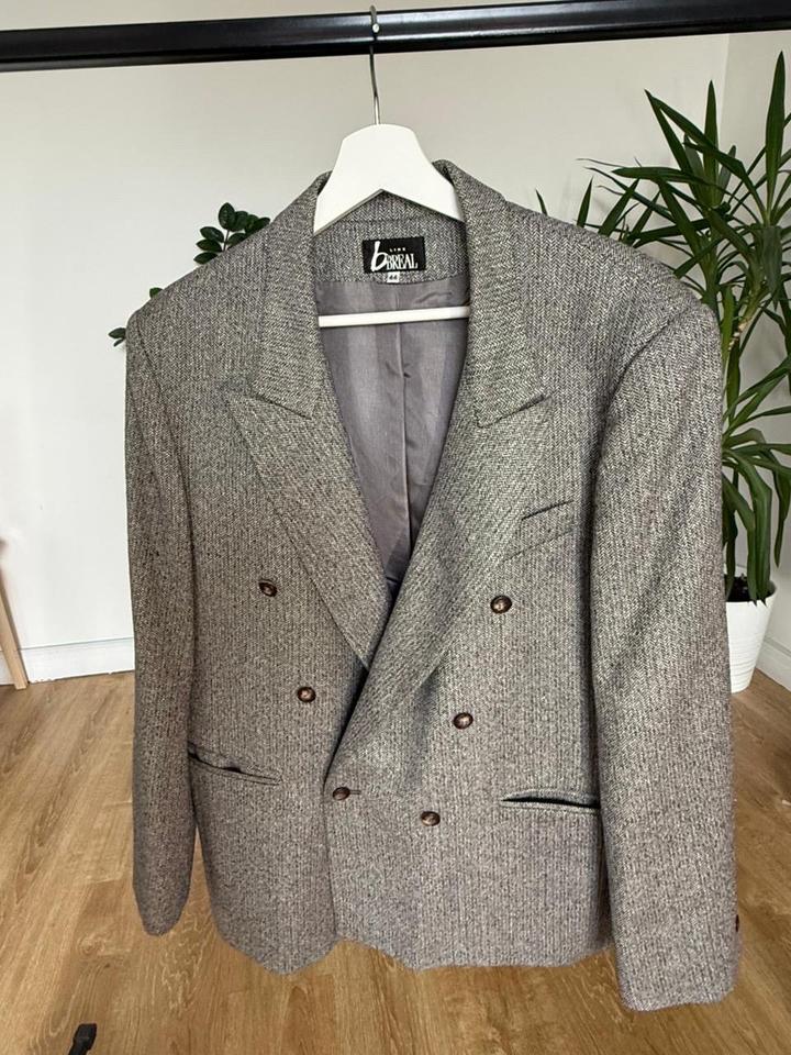 Серый твидовый пиджак в ёлочку, двубортный, шесть коричневых пуговиц. Широкие лацканы, боковые карманы. Серая подкладка. Классика винтажного стиля. Артикул: 588775