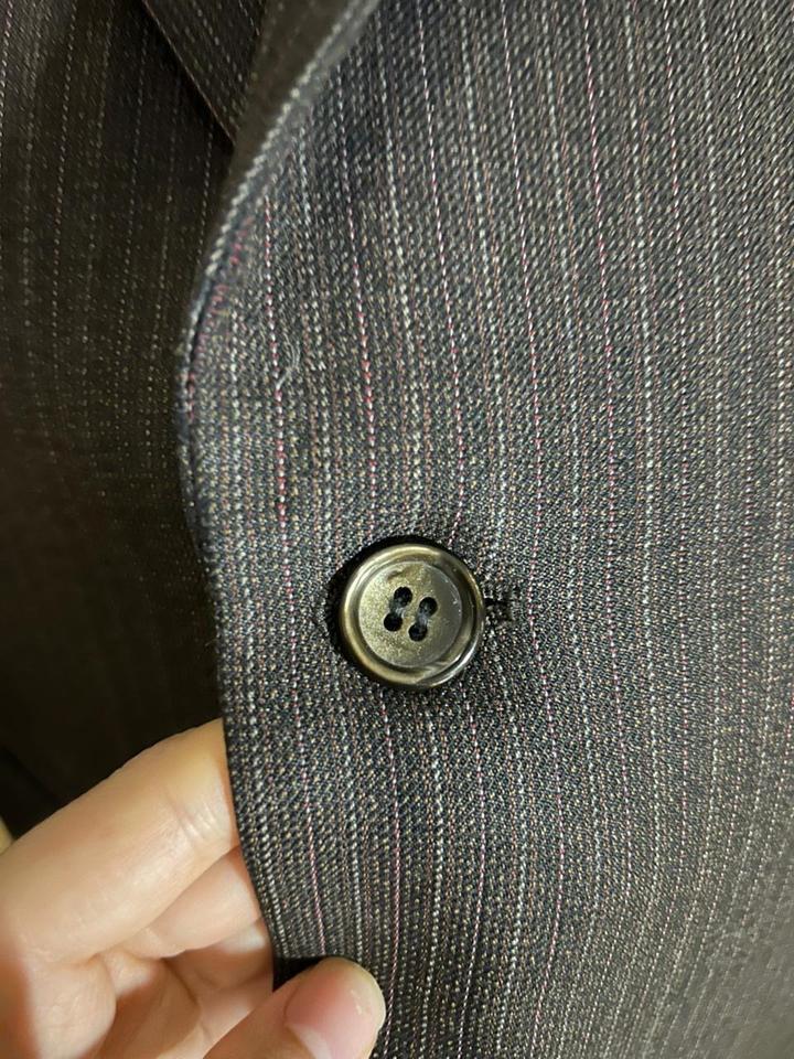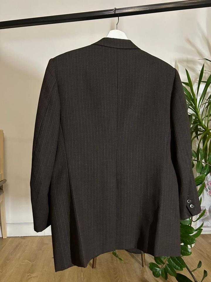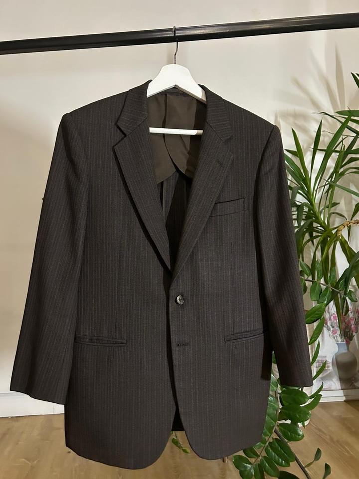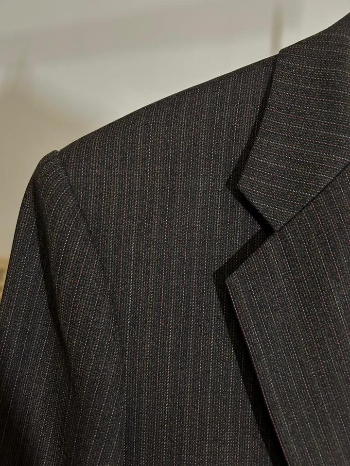 Тёмно-коричневый пиджак в тонкую полоску с красной нитью. Ткань Glanford — сделано в Англии. Японский пошив Alanet Royal, внутри вышиты японские иероглифы. Однобортный, одна пуговица, широкие лацканы. Артикул: 588836