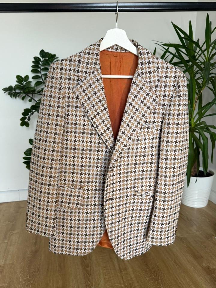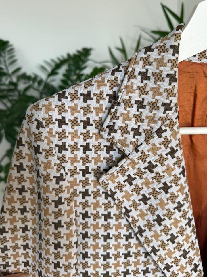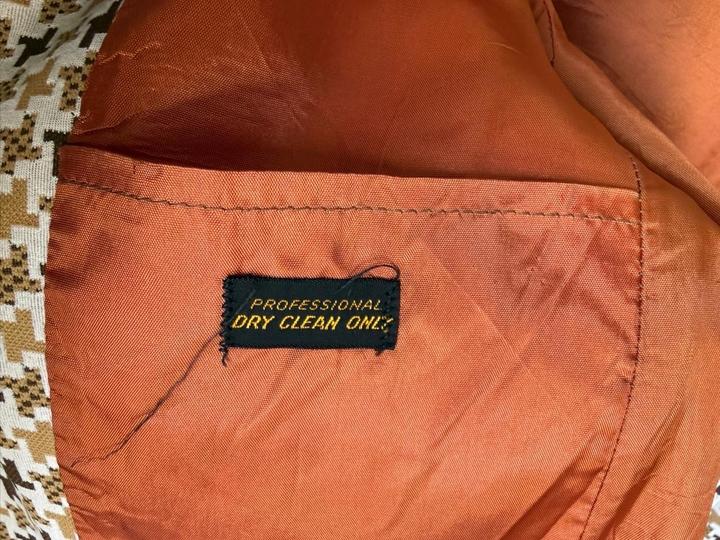 Бело-коричнево-шоколадный принт в крупный гусиный лапки, оранжевая подкладка. Широкие лацканы — типичный стиль 70-х. Яркая и редкая вещь. Уход: только химчистка. Артикул: 588839