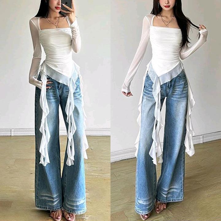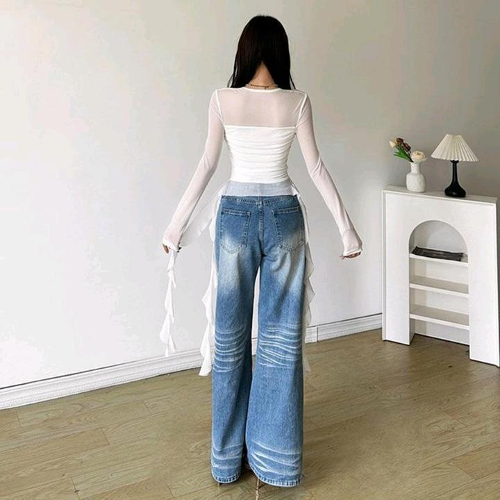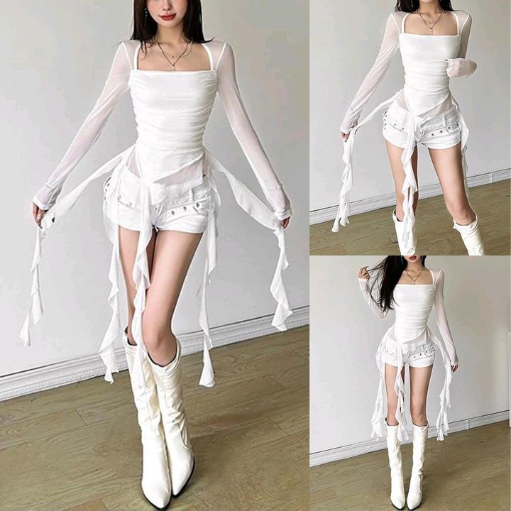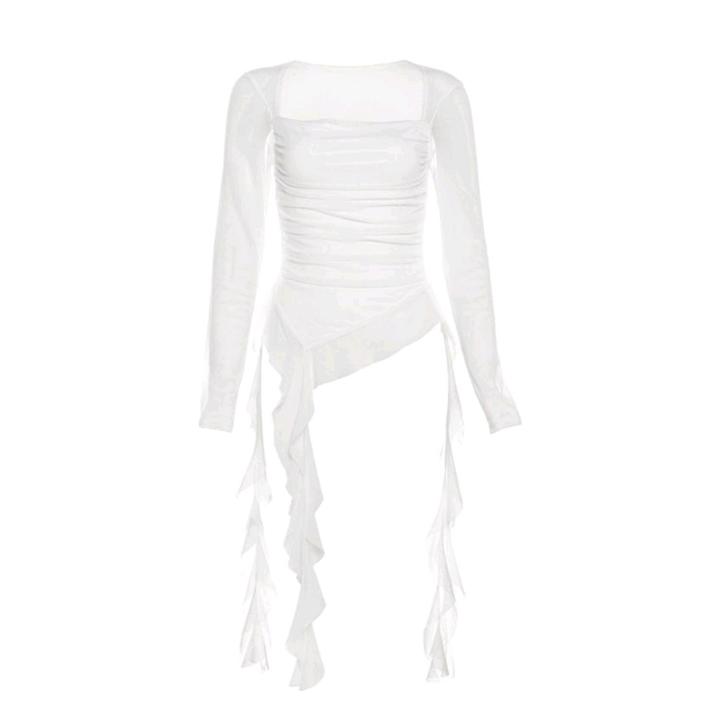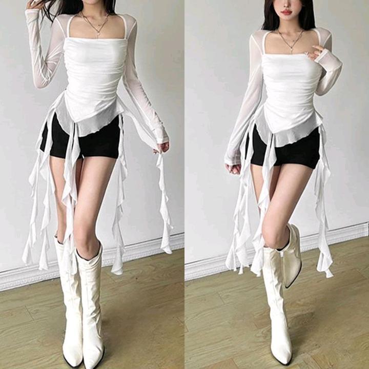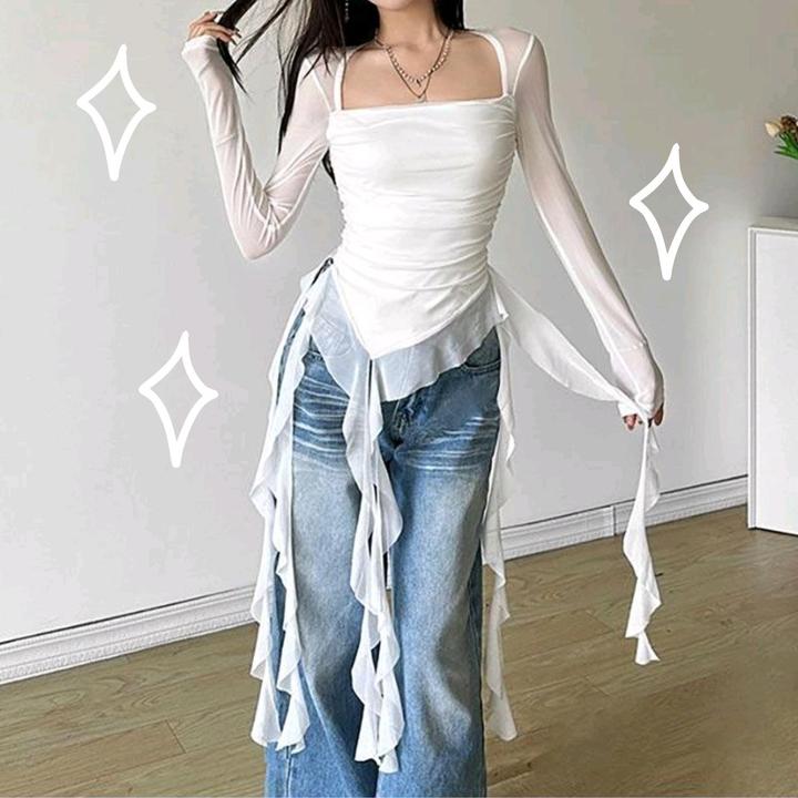 Красивая женская кофта со струящимися рюшами, ассиметричным низом и лёгкими рукавами из сеточной ткани Артикул: 588964