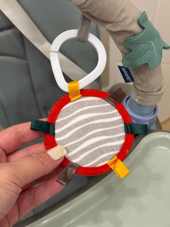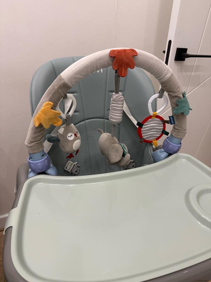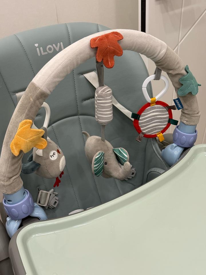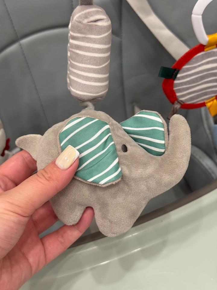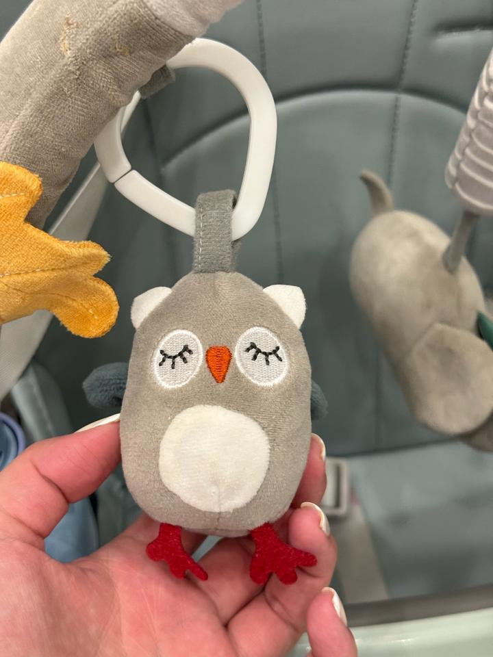 Мобиль для детского стола, кровати и коляски. Шикарного качества. Сова, слоненок с погремушкой который деликатно гремит, круг с фольгированным зеркалом с обратной стороны. Все игрушки сьемные, держатель регулируются. Артикул: 589158