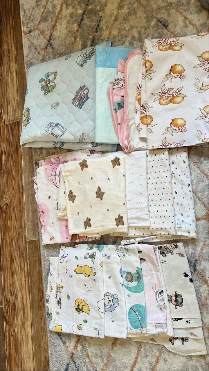 5 хлопковые, 1 Фланелевые, 1 трикотажные 1 наматрасник, 2 непромокаемые В хорошем состоянии, некоторые новые Артикул: 590319