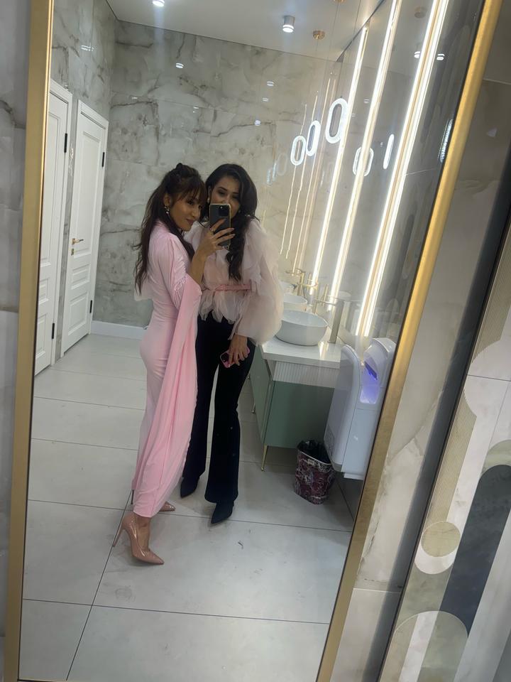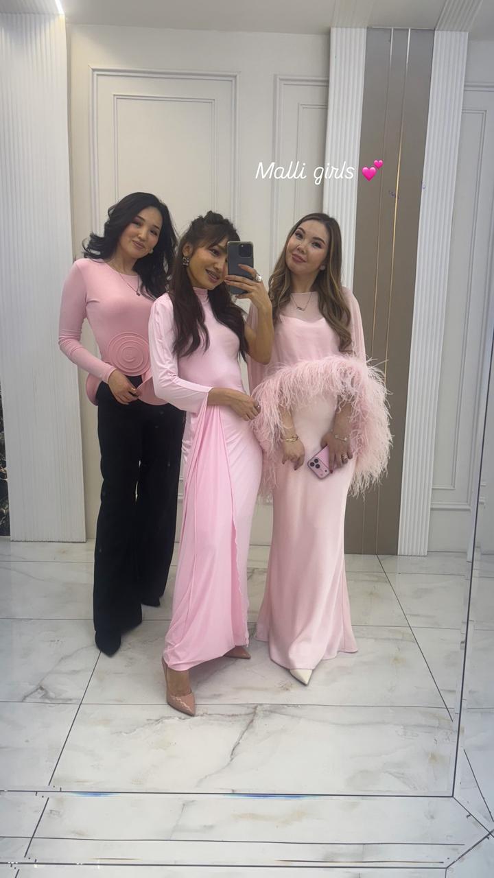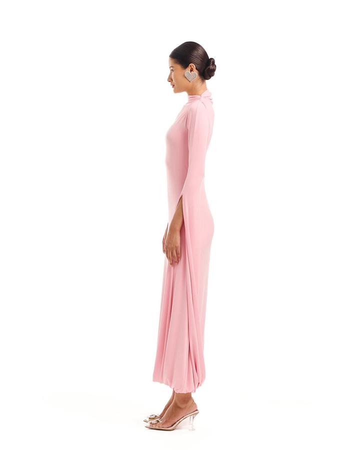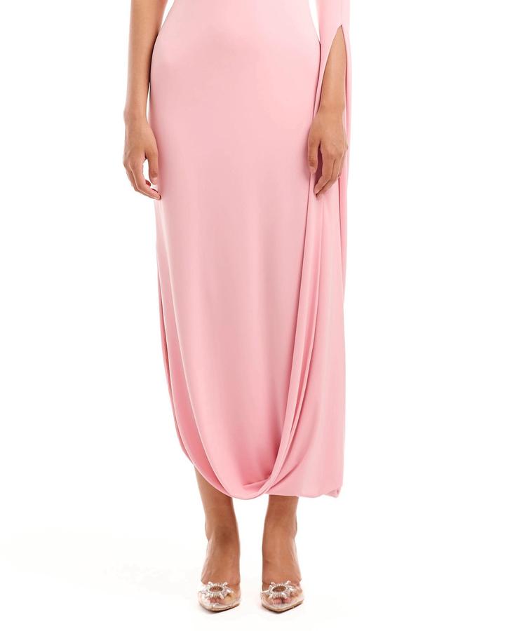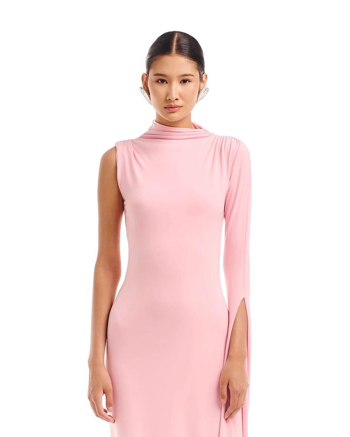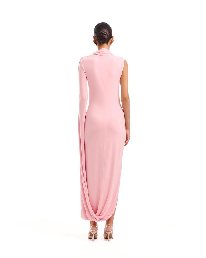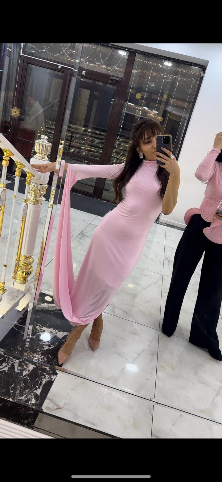 Платье розового цвета выполнено из струящейся ткани и имеет асимметричный дизайн. Одна сторона платья без рукава, в то время как другая украшена длинным рукавом, переходящим в драпировку, образующую эффектную петлю. Воротник стойка добавляет строгости, а зауженный силуэт подчеркивает фигуру. Длина миди, подол также оформлен с мягкой драпировкой. Ткань трикотаж масло Состав: 15% вискоза +7### ### ## ##янии. После химчистки, имеется чехол Артикул: 590396