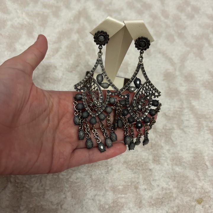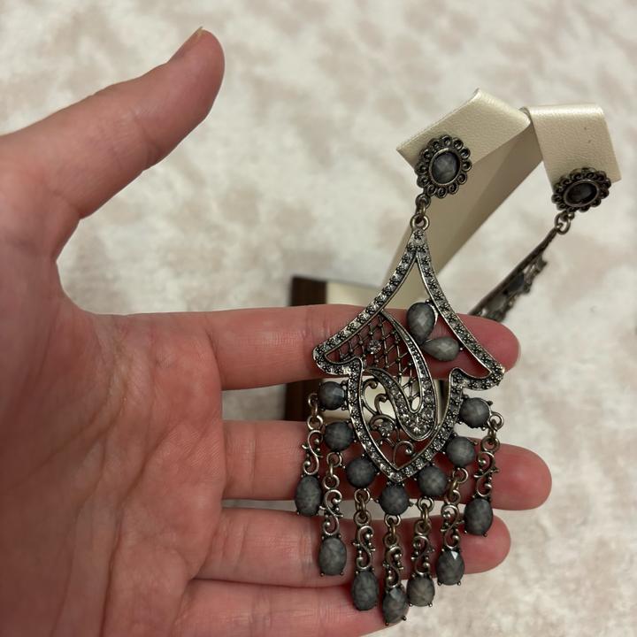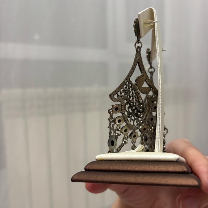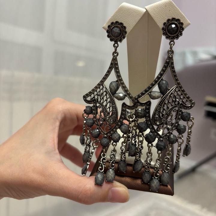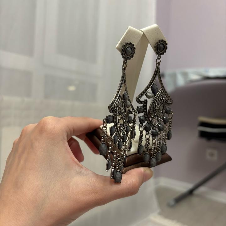 Изысканные висячие серьги в индийском стиле — это гармония восточной роскоши и современного дизайна. Украшение выполнено в благородной серой гамме, которая придаёт образу элегантность и универсальность. Длинная форма серёг визуально вытягивает лицо и подчёркивает линию шеи, делая образ более утончённым. Такие модели часто используются как акцентный аксессуар и подходят как для вечерних выходов, так и для стильных повседневных образов. Артикул: 590561
