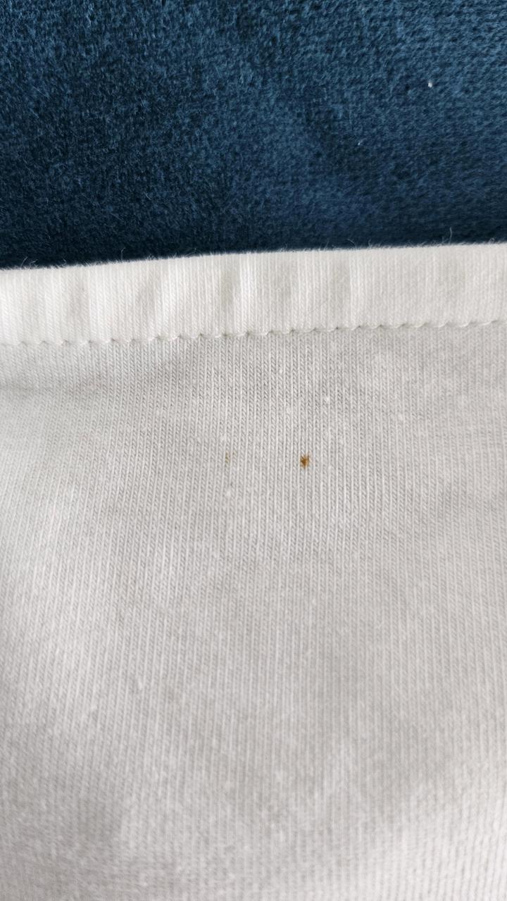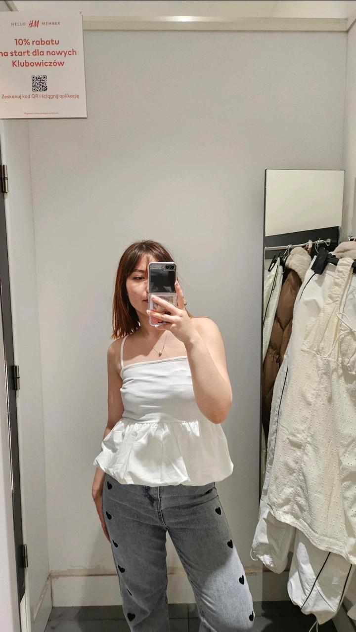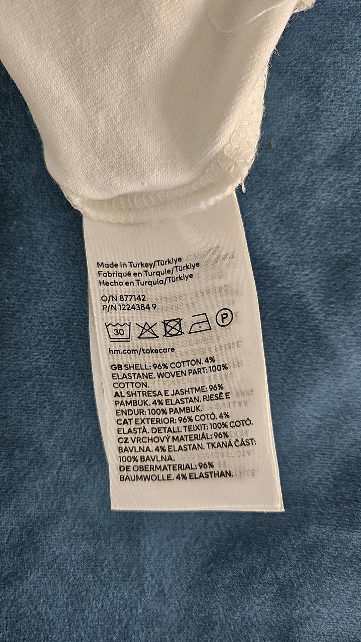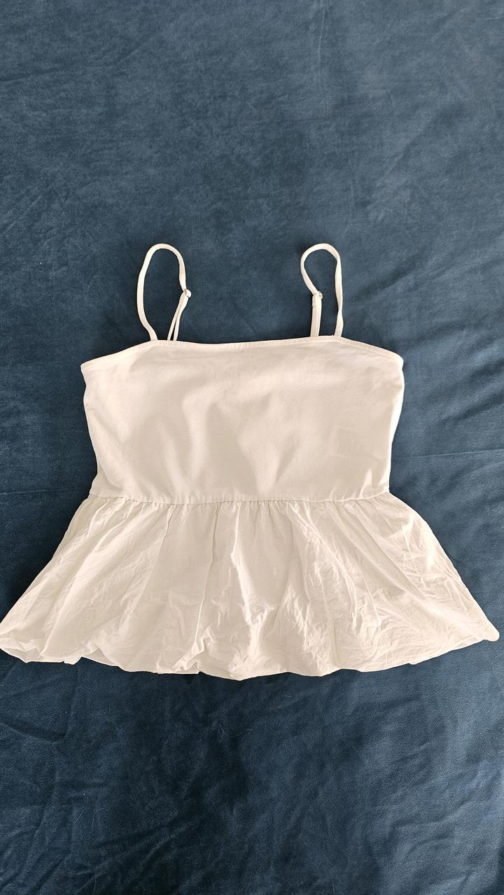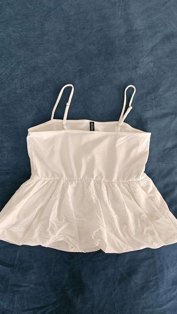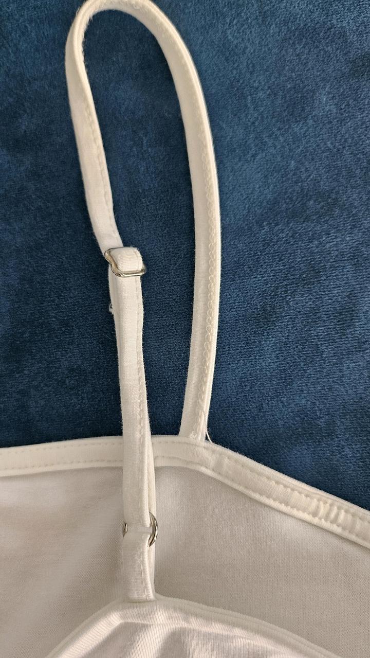 Хлопковая майка H&M с регулирующей длиной бретель. Брала в Польше, надевала один раз. Красивая, но немного просвечивает, поэтому лучше носить с топом без лямок или с прозрачными лямкамм. Есть очень маленькое пятнышко на передней части, но оно микроскопическое, фото прекрепила. Артикул: 590922