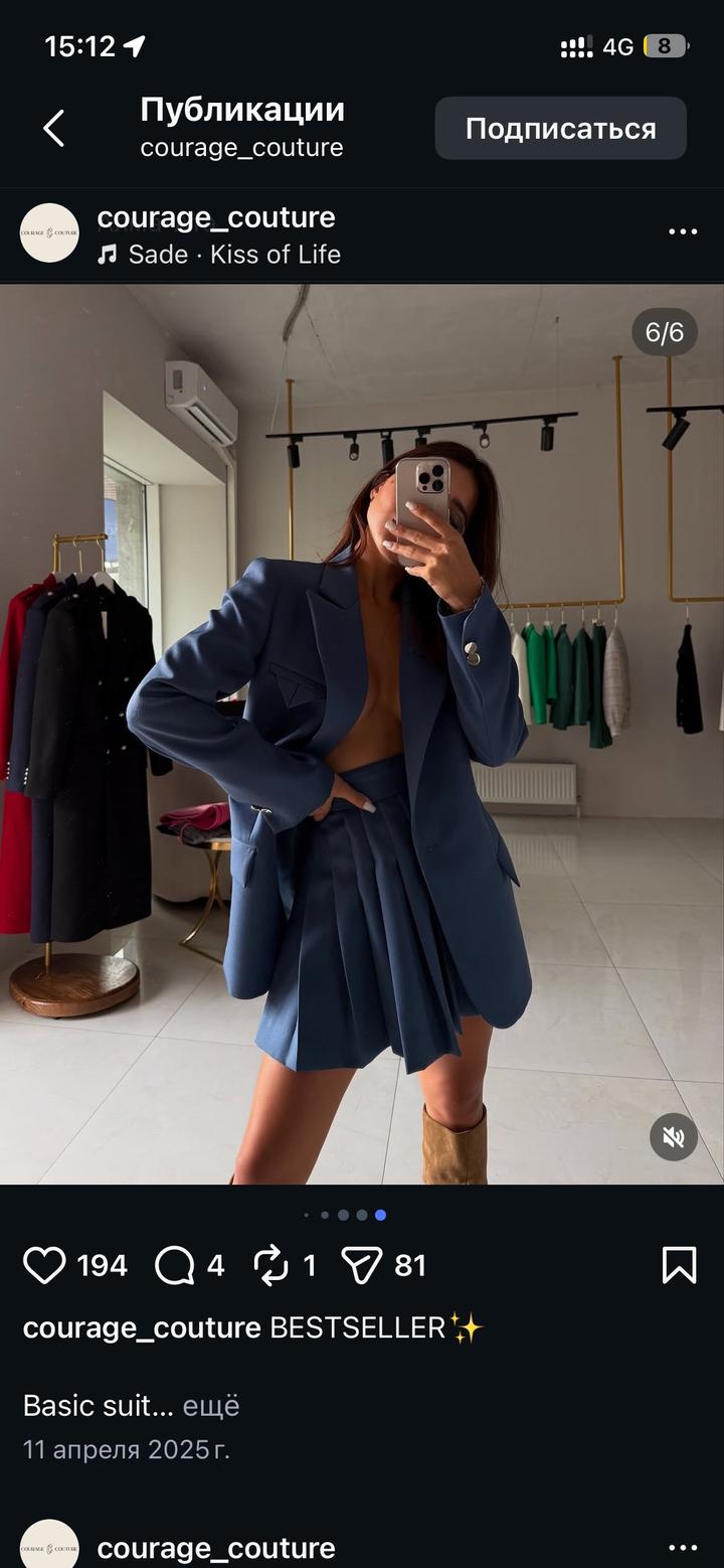 Basic suit courage_couture Элегантность в каждом движении. Классический костюм с удлиненным жакетом и плиссированной юбкой в роскошном цвете создаёт образ, в котором сочетаются стиль, комфорт и безупречный вкус. К данному жакету также доступны к пошиву брюки и шорты, на ваш выбор. Made in Kazakhstan Покупала за : Юбку 35 к , пиджак 75 к Артикул: 591218