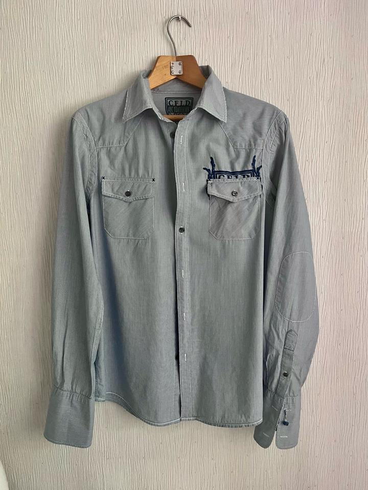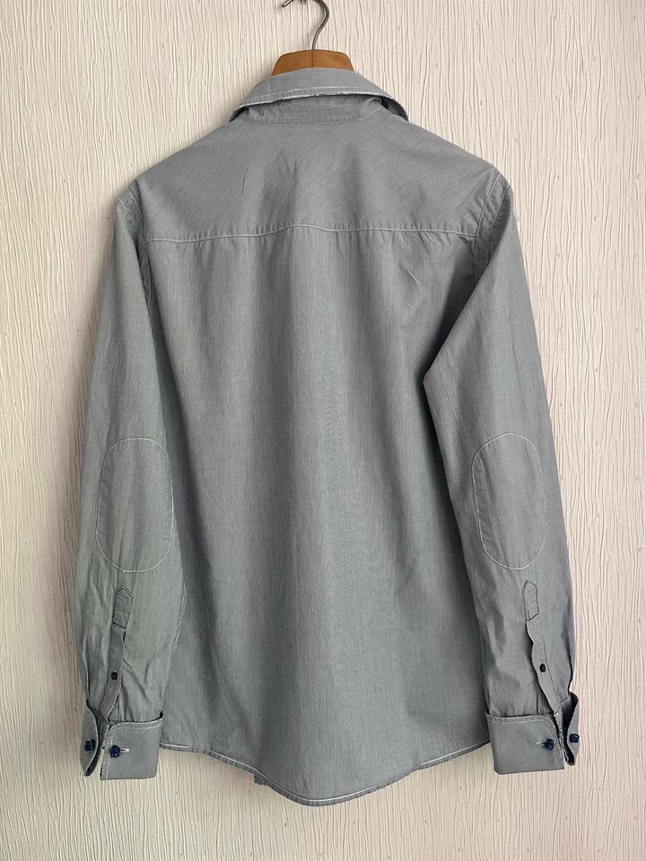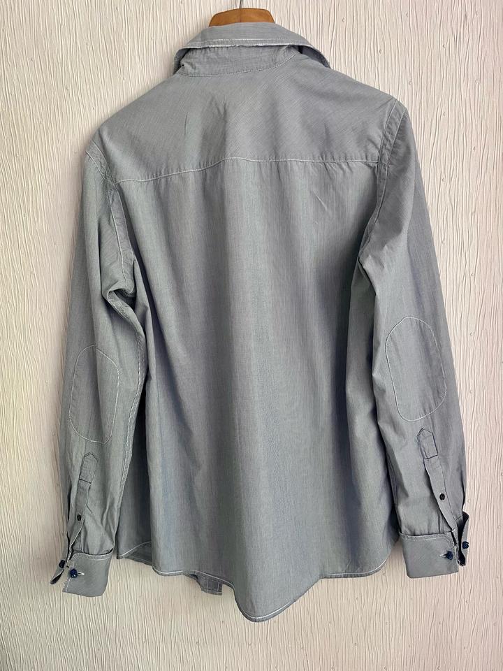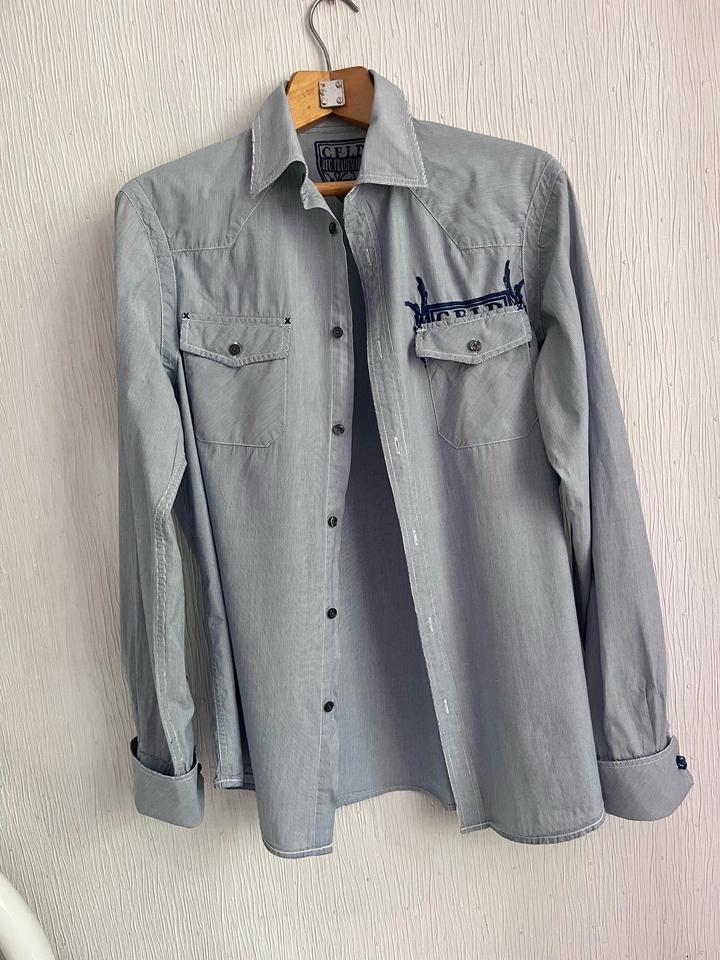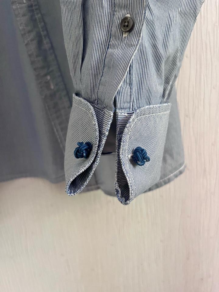 Эта винтажная сине-сероватая рубашка в мелкую полоску смотрится совершенно необыкновенно благодаря своим деталям: - вшитые запонки, - вышивка, - эффект потертости, - и налокотники-нашивки, которые сейчас снова в моде. Качество отличнейшее. Состояние очень хорошее. Технически вещь мужская, но подойдет и стильной женщине. К вшитым запонкам (см. Фото) можно добавить и дополнительные запонки. Заходите в профиль, там еще много необычных вещей для мужчин, женщин и детей. Есть скидка на корзину Артикул: 591248