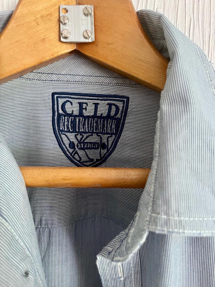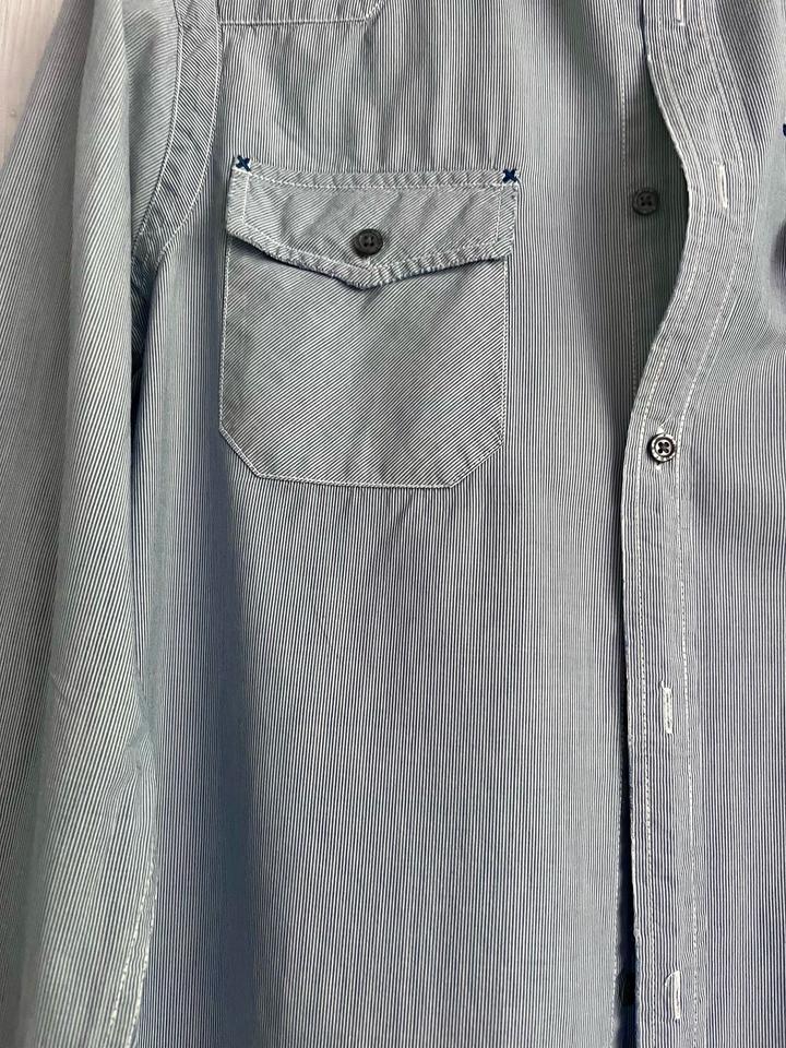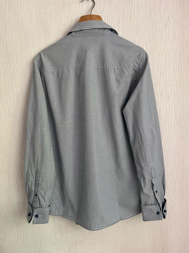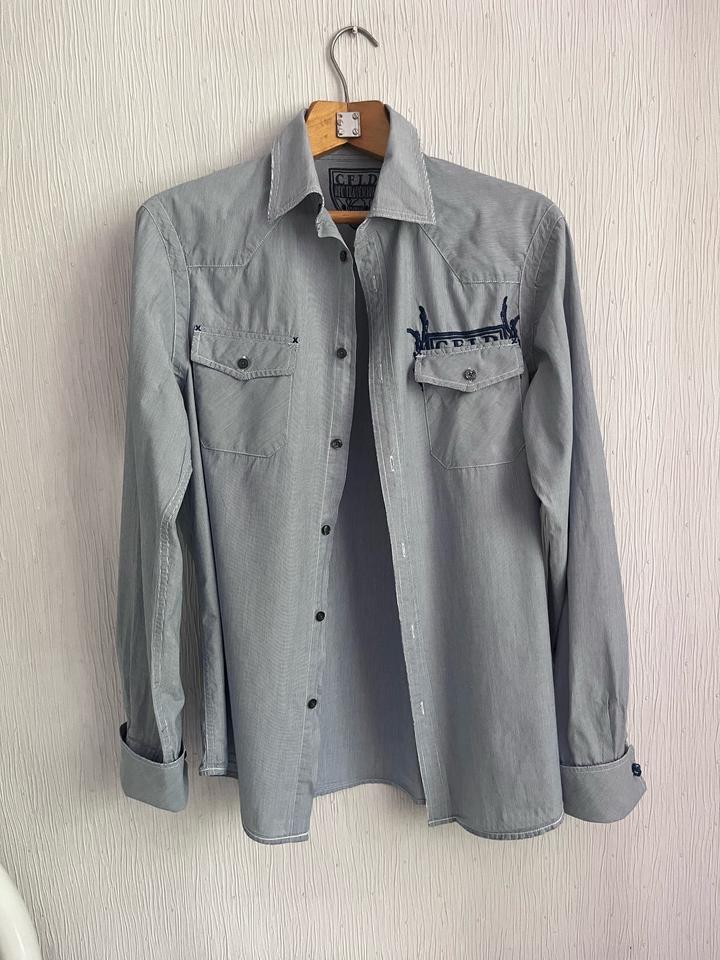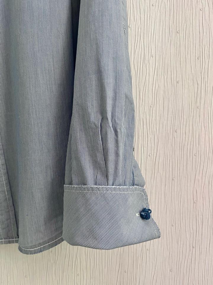 Эта винтажная сине-сероватая рубашка в мелкую полоску смотрится совершенно необыкновенно благодаря своим деталям: - вшитые запонки, - вышивка, - эффект потертости, - и налокотники-нашивки, которые сейчас снова в моде. Качество отличнейшее. Состояние очень хорошее. Технически вещь мужская, но подойдет и стильной женщине. К вшитым запонкам (см. Фото) можно добавить и дополнительные запонки. Заходите в профиль, там еще много необычных вещей для мужчин, женщин и детей. Есть скидка на корзину Артикул: 591248