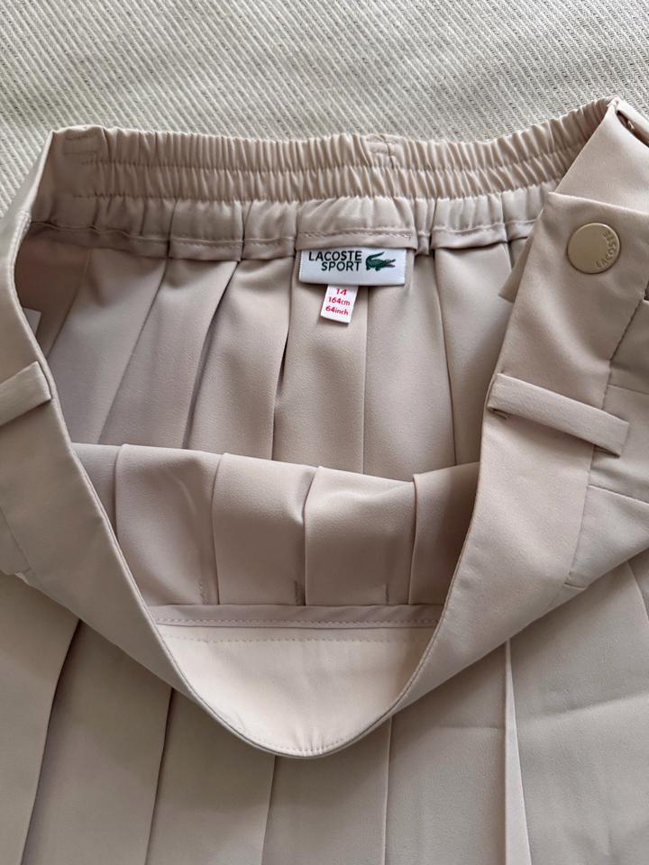 бежевая плиссированная мини-юбка (часто называемая теннисной юбкой). Стиль: Спортивный шик / Теннисный стиль. Детали: Равномерные складки (плиссе), шлевки для ремня, фирменный логотип бренда. Артикул: 591413