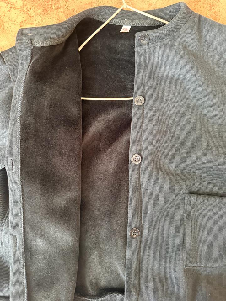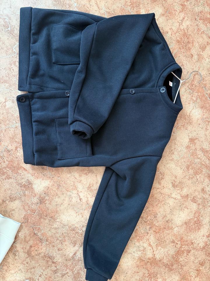 Трикотажный бомбер темно-синего цвета. Внутри утеплен мягким флисом. Состояние отличное, надевали пару раз. Артикул: 591501