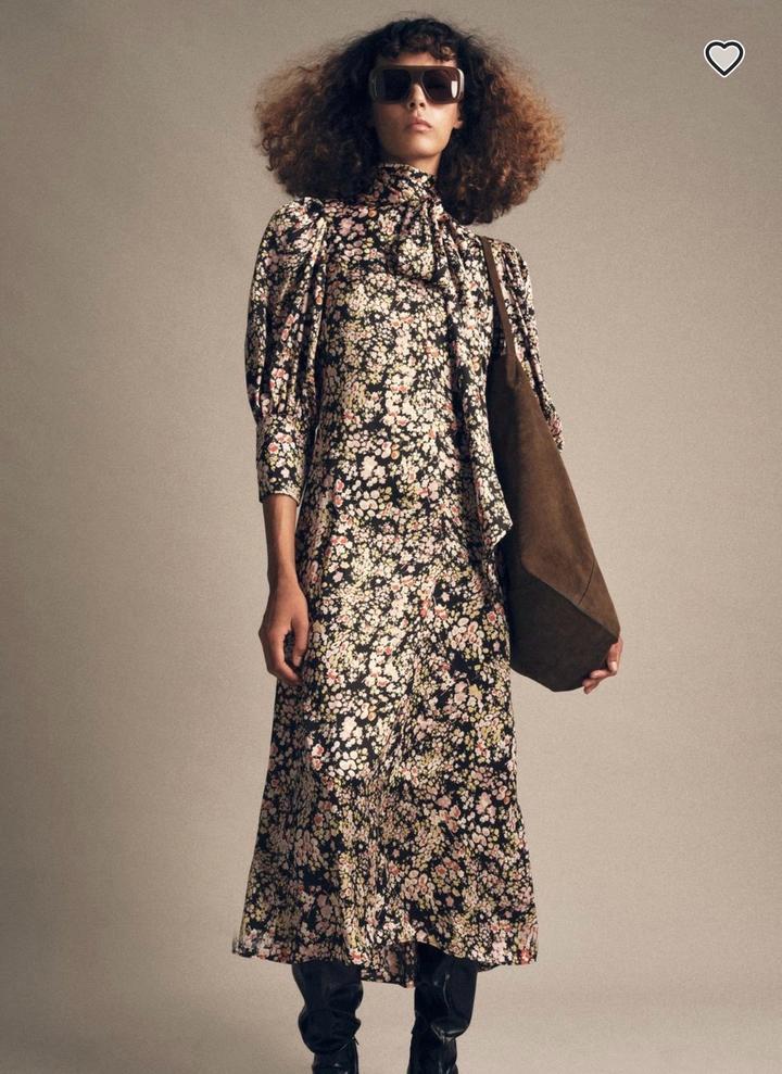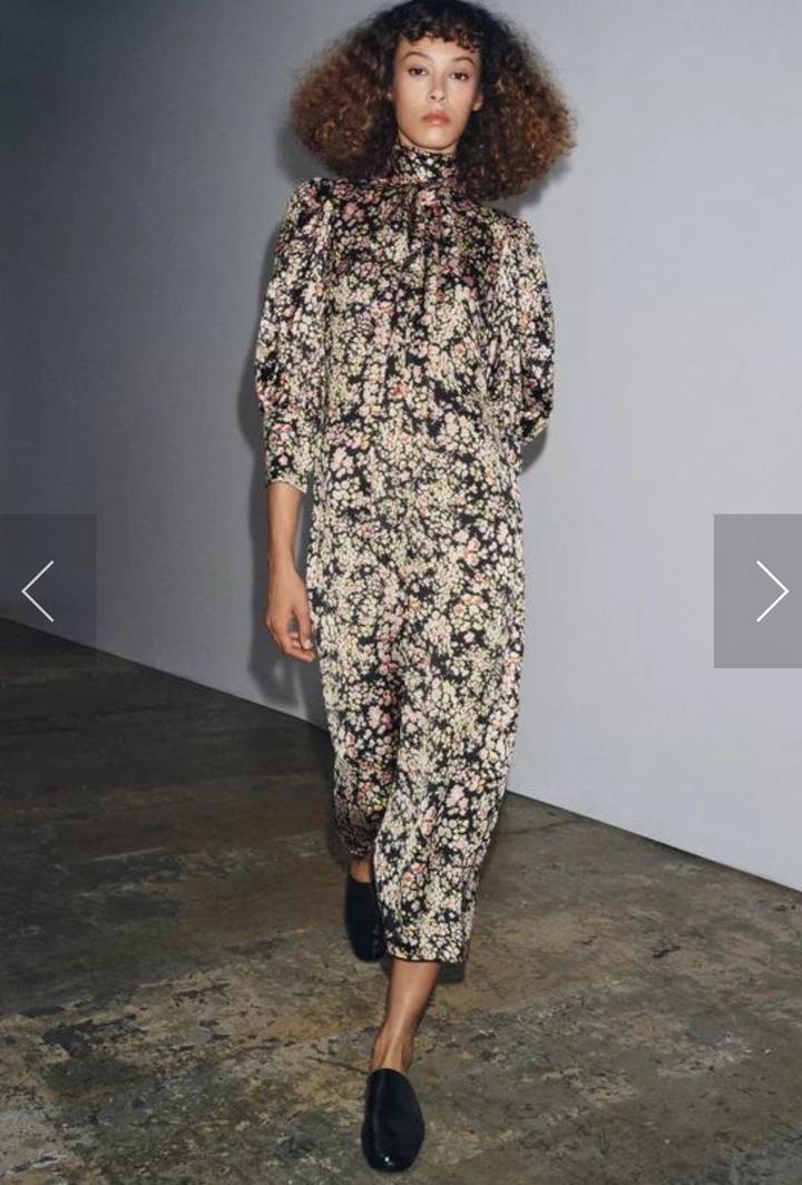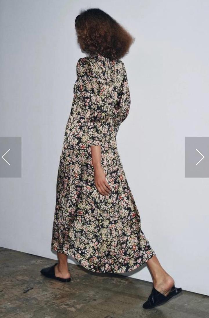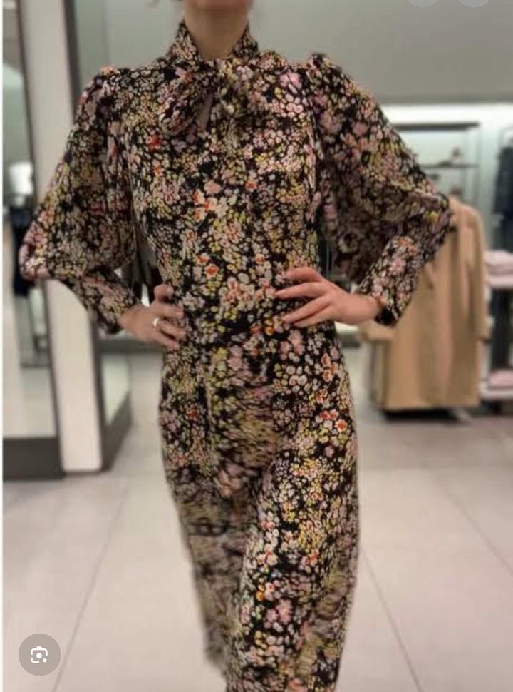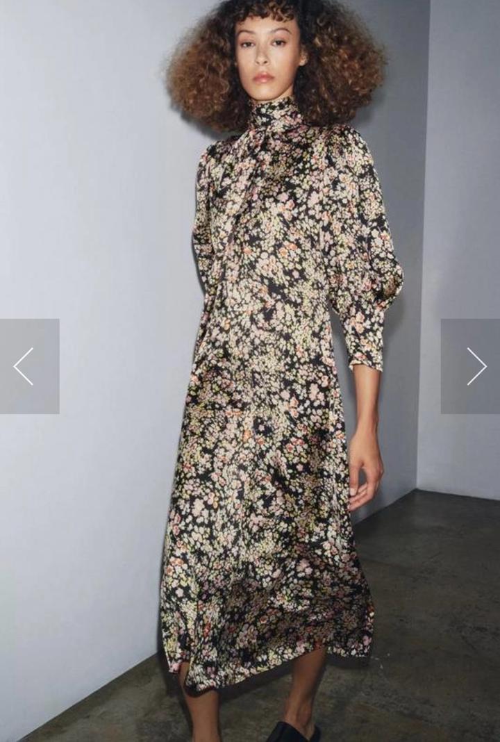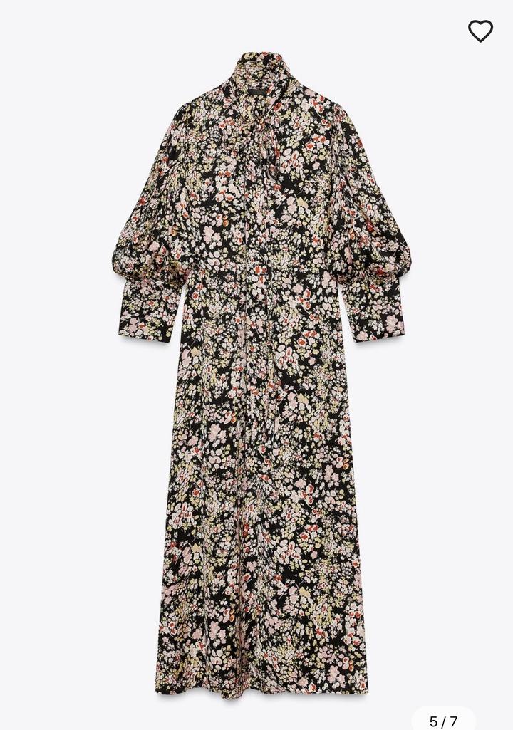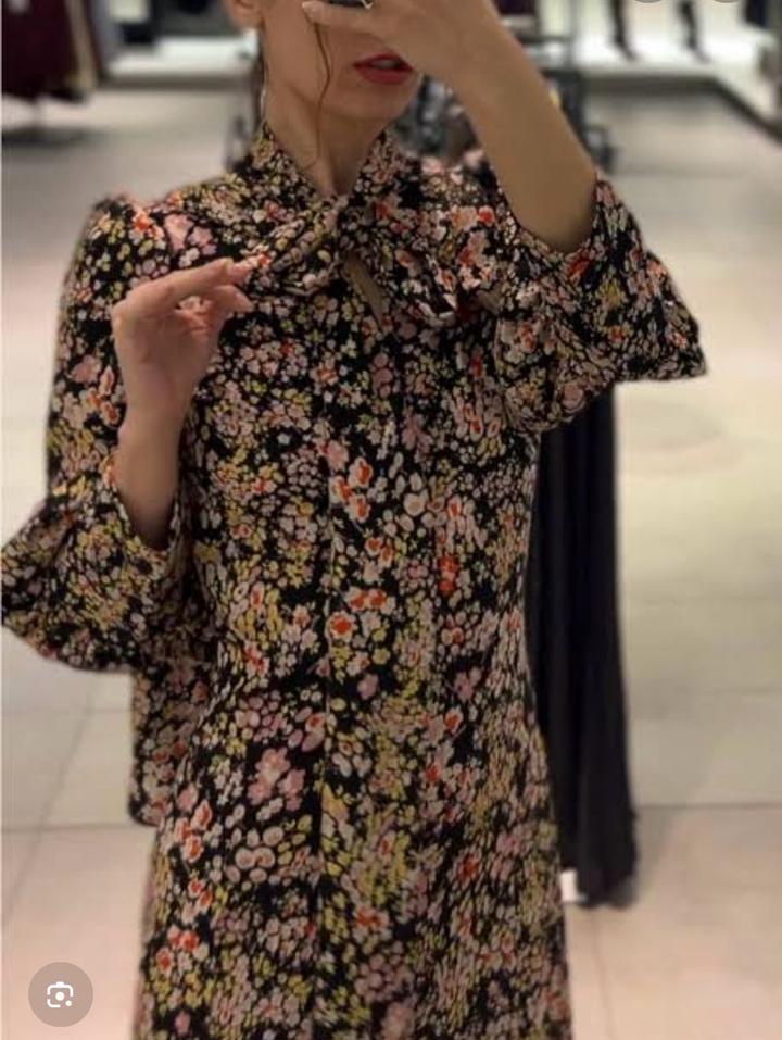 Новое платье миди от Zara Коллекция ZW Collection за 39.990 Размер М Принт цветочный Ткань атлас Платье миди с круглым вырезом и V-образным вырезом, регулируемым завязками из той же ткани. Длинные объемные рукава с манжетами. Цветочный принт. Асимметричный низ. Артикул: 591552
