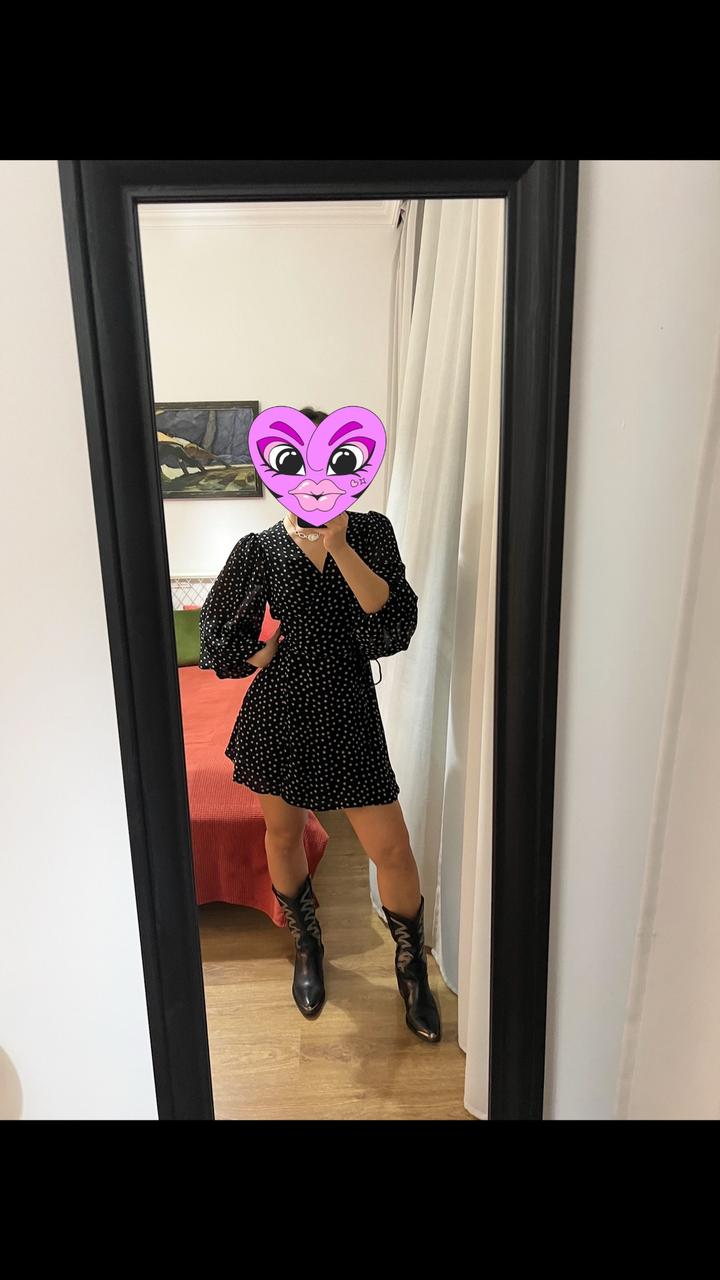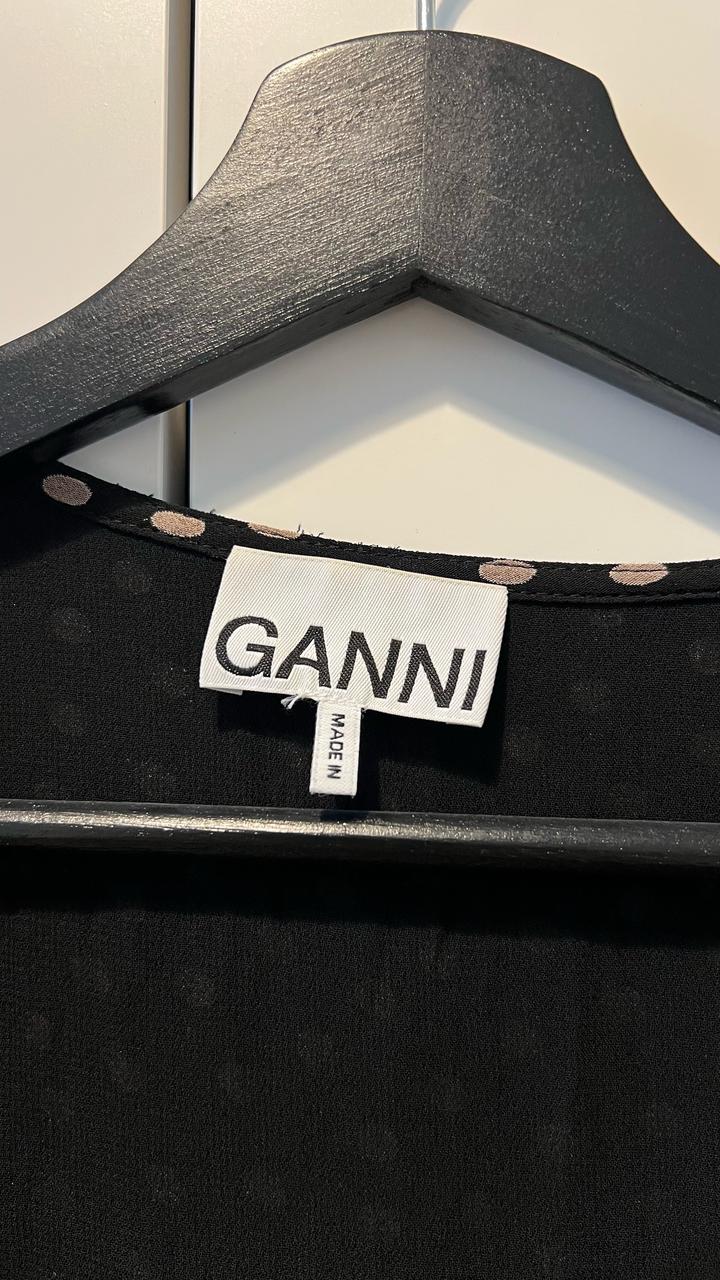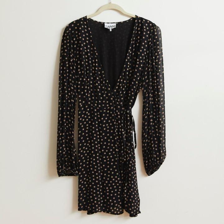 Платье Ganni в мелкий горох из викозы. Модель на запах — красиво подчёркивает талию и позволяет регулировать посадку под себя. Женственный силуэт, лёгкая ткань, объёмные рукава. Длина мини. Смотрится аккуратно и современно. Надевалось несколько раз, состояние отличное. Продаю, потому что сейчас не ношу. Артикул: 591569