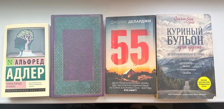 1) Альфред Адлер «понять природу человека» НОВАЯ 2) воровка книг 3) Джеймс Деларджи «55» НОВАЯ 4) Куриный бульон для души За все 6 000 тенге Артикул: 591613