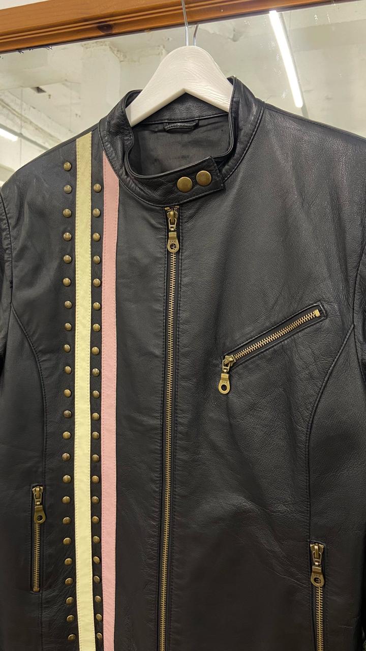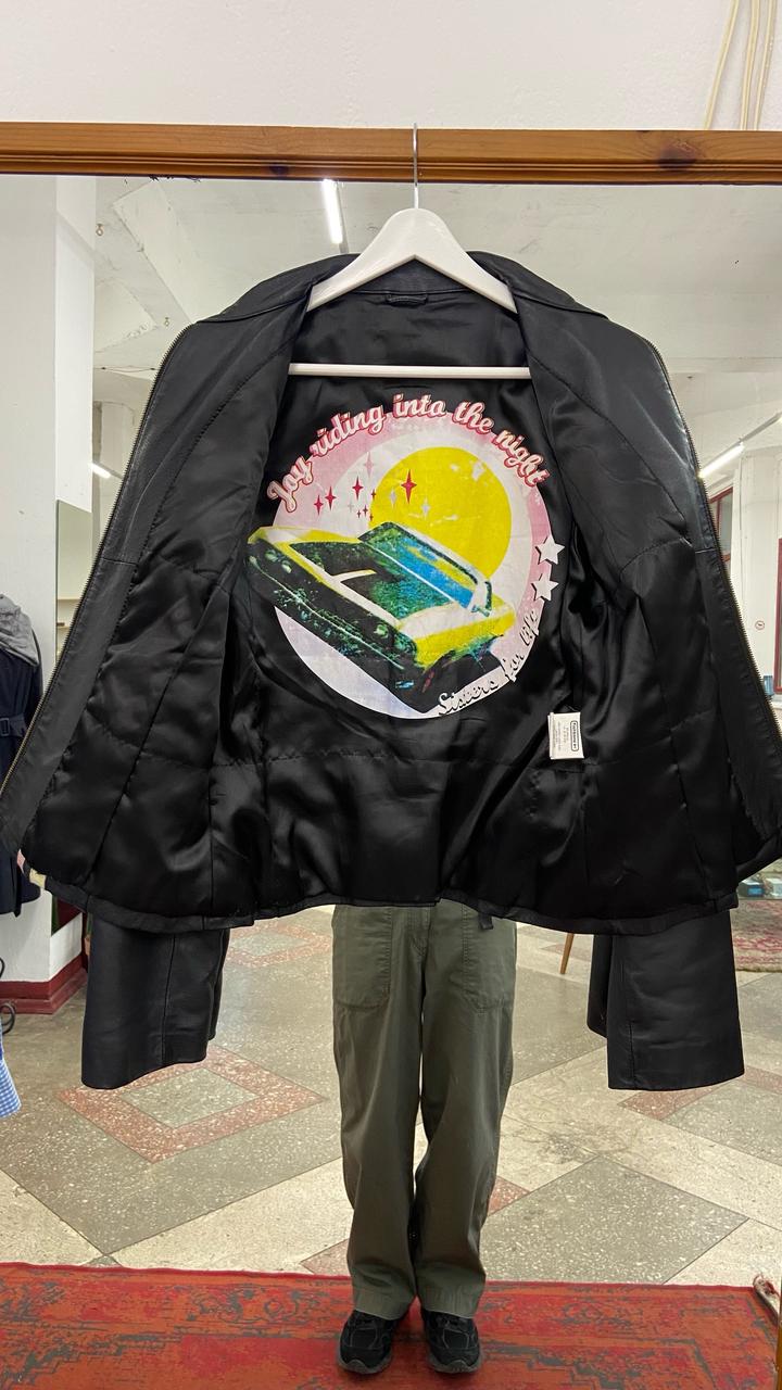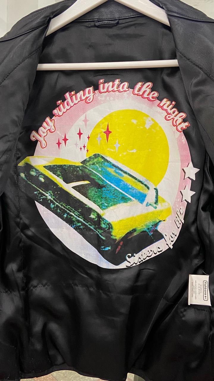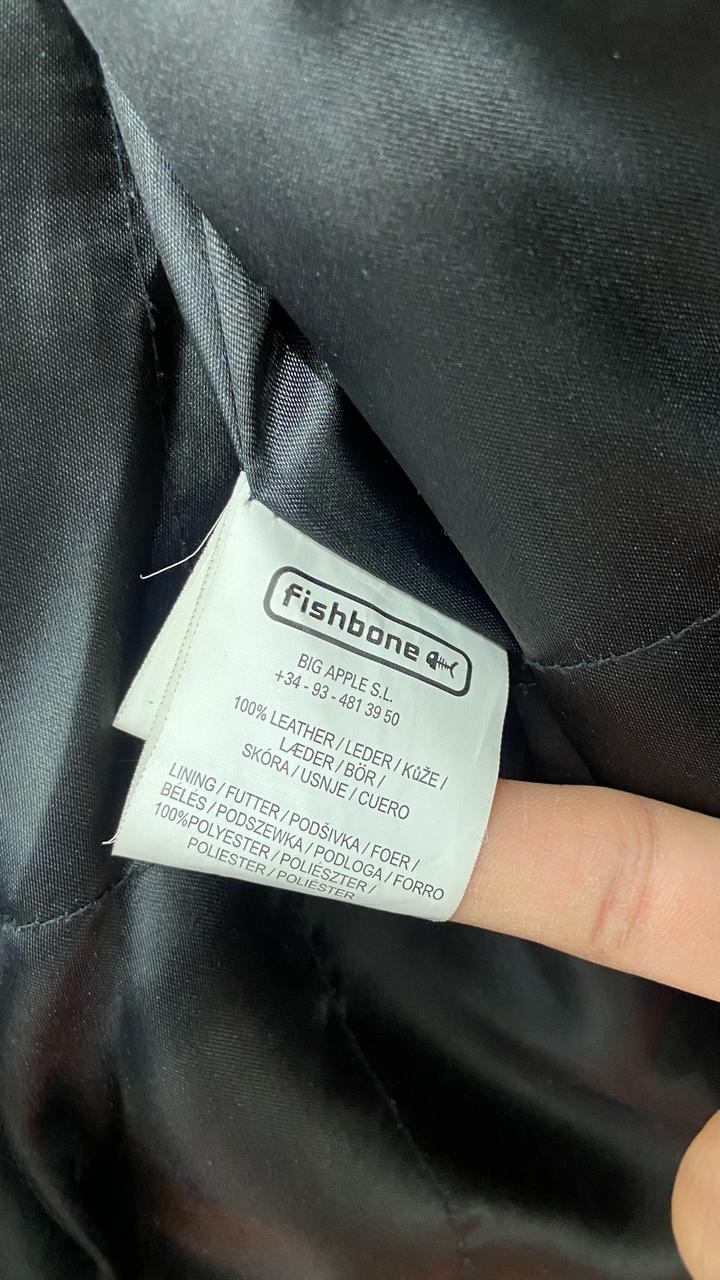 Продаю оригинальную кожаную куртку от бренда Fishbone. Очень стильная и необычная модель, которая точно выделит вас из толпы!Главная фишка: на спине — яркий, детализированный принт в ретро-стиле с изображением автомобиля, луны и надписью «Joy riding into the night». Спереди куртка украшена вертикальными полосами из страз/клепок (серебристые и золотистые), что придает ей рокерский шик.Материал: Натуральная кожа (очень мягкая и качественная). Подкладка — полиэстер. Цвет: Черный.Размер: XL (по бирк Артикул: 591776