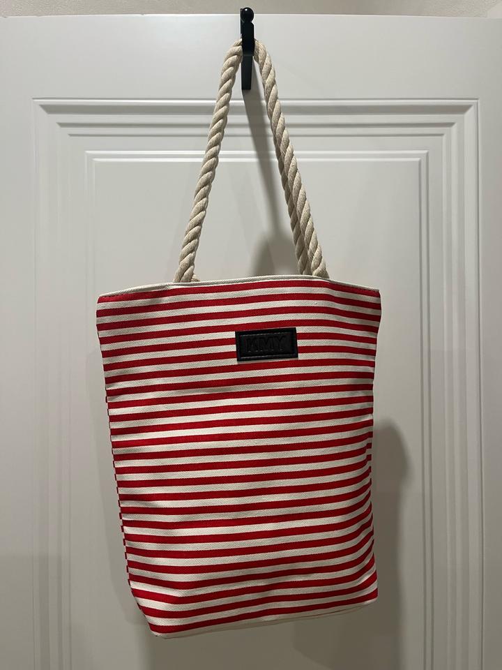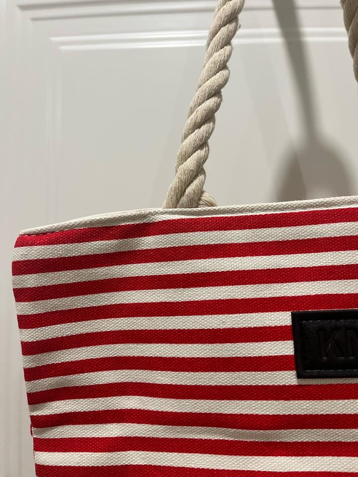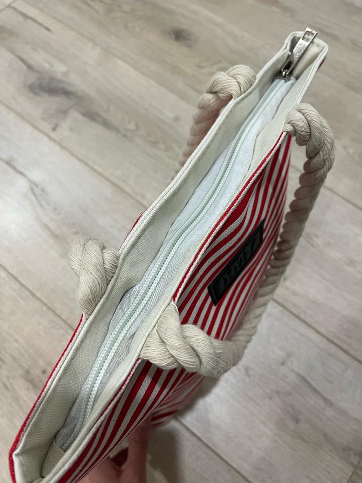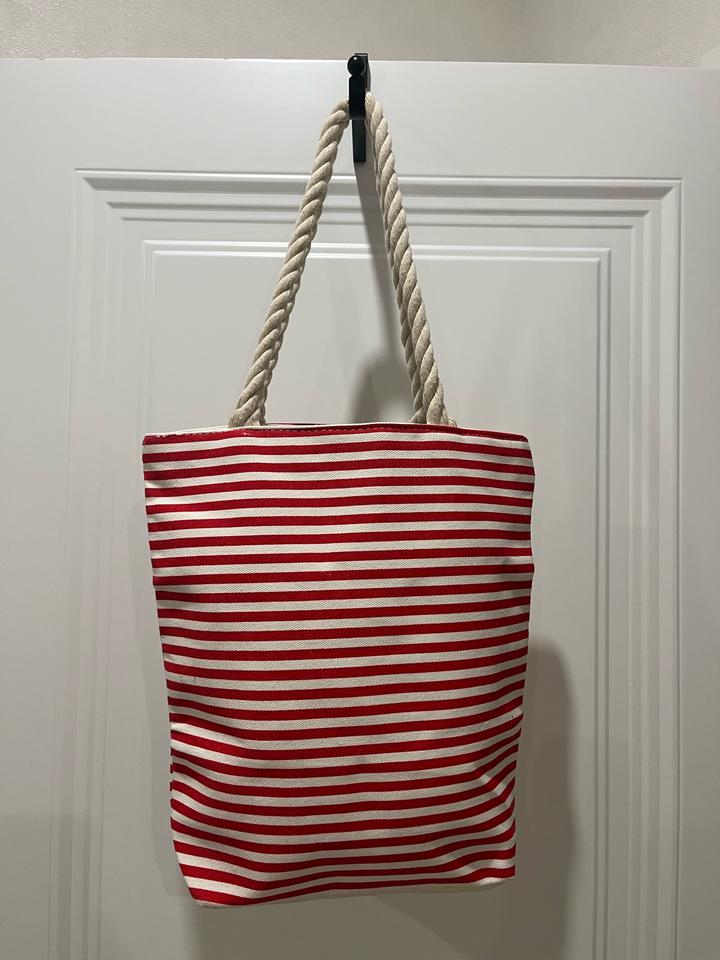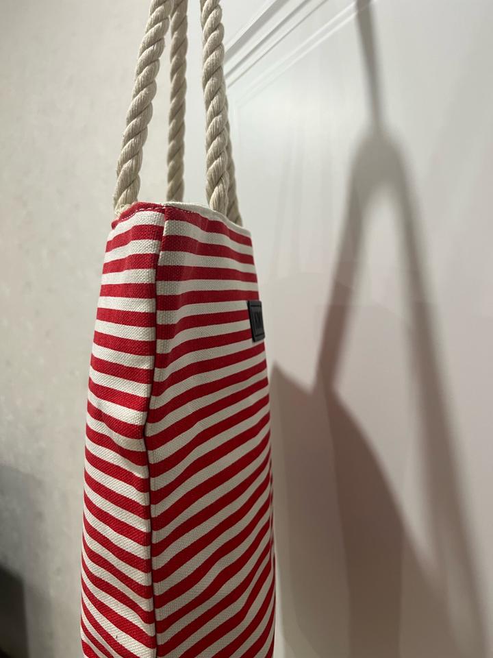 Сумка красно-белого цвета, из плотной хлопковой ткани. Новая, идеально на летние прогулки и на отдых. Высота ручки 23 см, ширина сумки 32 см, высота 34. Ширина дна 9 см Артикул: 591787