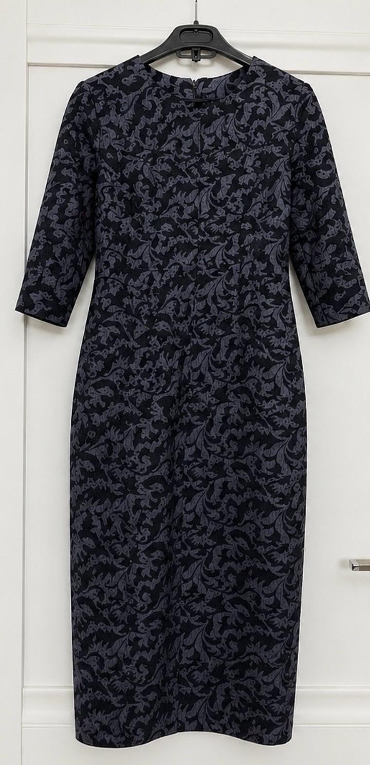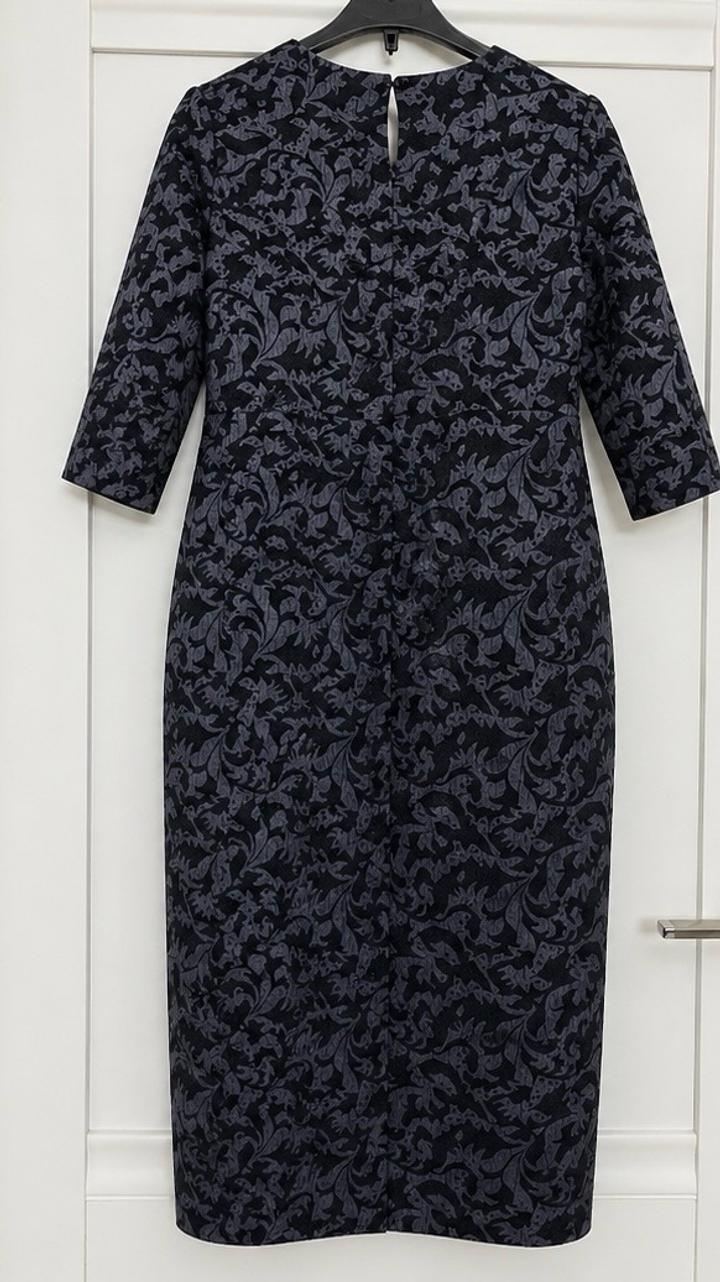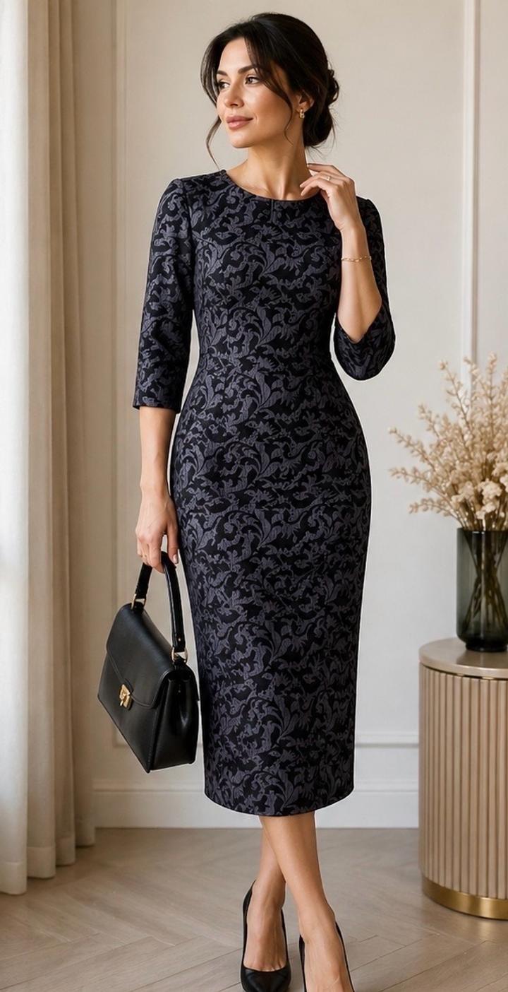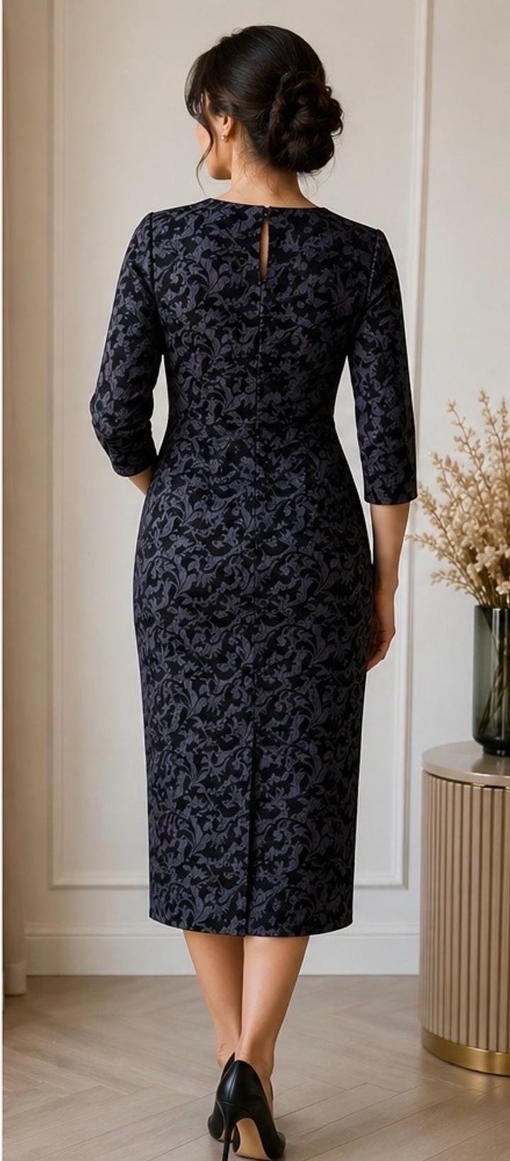 Элегантное платье-футляр из плотного жаккарда с благородным рельефным узором. Изделие выполнено в формате handmade — аккуратный пошив, внимание к деталям и качественная посадка. Жаккардовая ткань с вплетённым узором (не принт) создаёт эффект дорогого изделия и отлично держит форму. Платье красиво садится по фигуре, подчёркивает силуэт и визуально стройнит. Длина миди — 106 см: сдержанный, элегантный и актуальный формат. Рукав 3/4 — универсальный вариант Глубокий графитовый оттенок Артикул: 591799