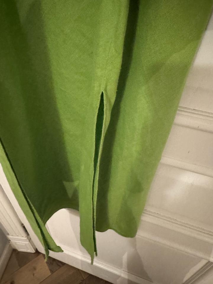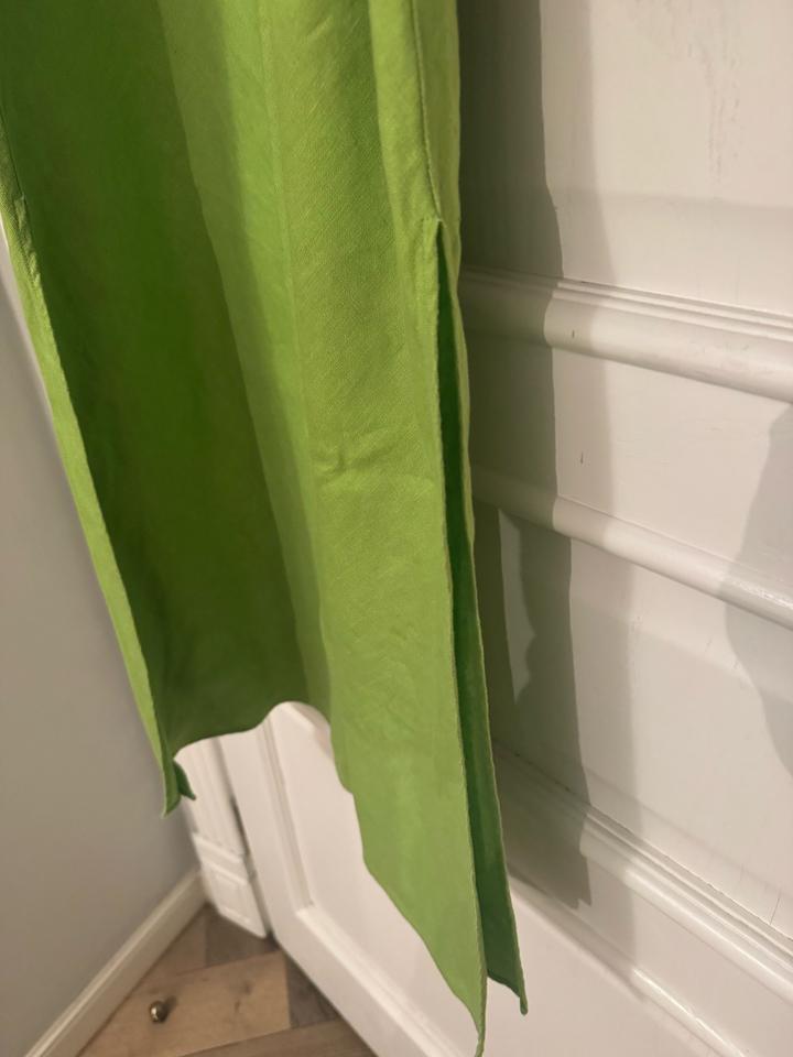 Летнее льняное платье на тонких бретельках, чуть свободного прямого покроя, вырезы по бокам вдоль ног. Цвет молодая зелень. Размер S-M. Состояние прекрасное. Состав: 100% лён Артикул: 591867
