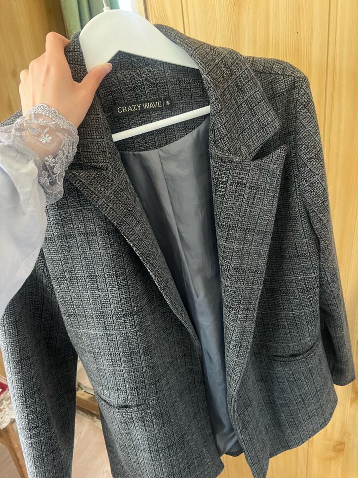 пиджак в классическом стиле. Он выполнен из плотной ткани с мелким клетчатым узором, что придаёт ему строгий и элегантный вид. Пиджак укороченного кроя, с лацканами и двумя карманами спереди. Внутри гладкая подкладка светло-серого цвета Артикул: 591967