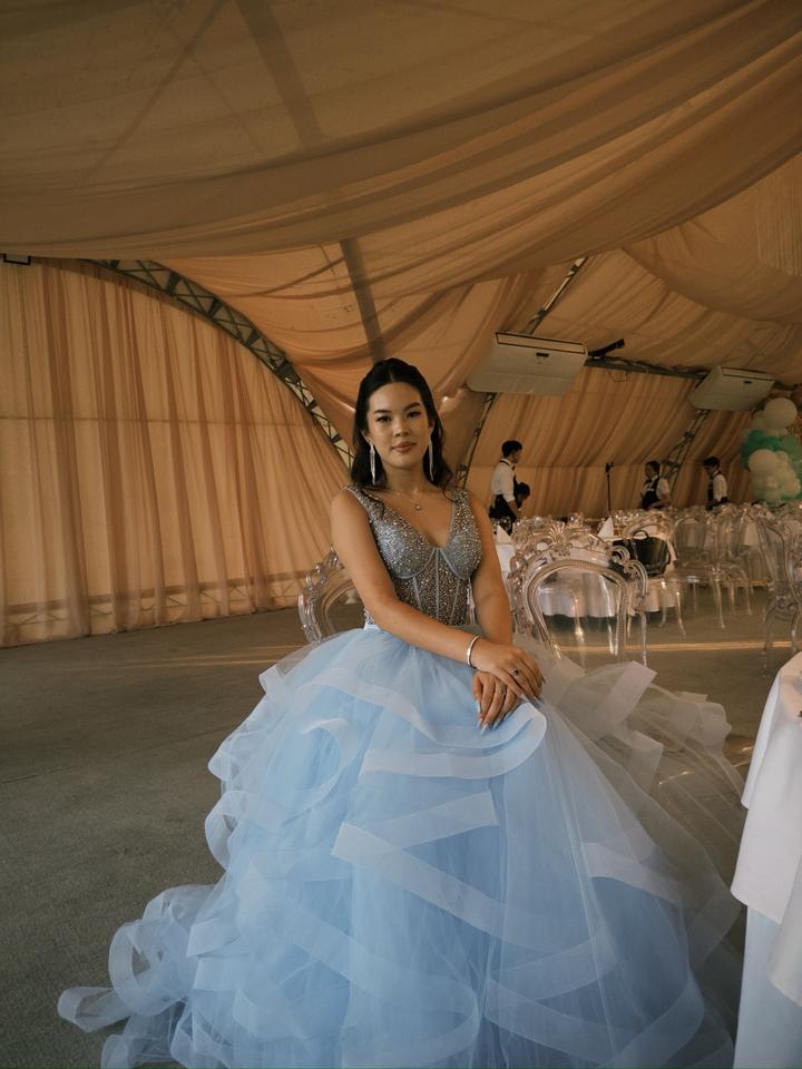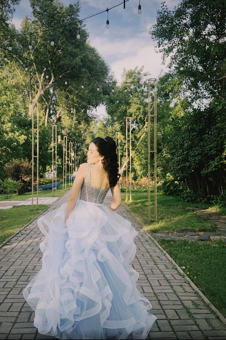 Голубое платье, с корсетным верхом и шлейфом. Покупала в Алмате за 120000. В отличном состоянии надевала только раз на выпускной. Артикул: 591981
