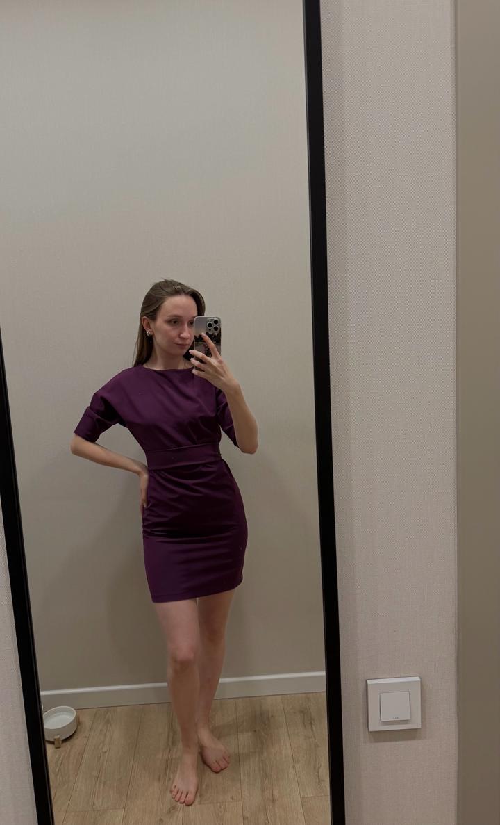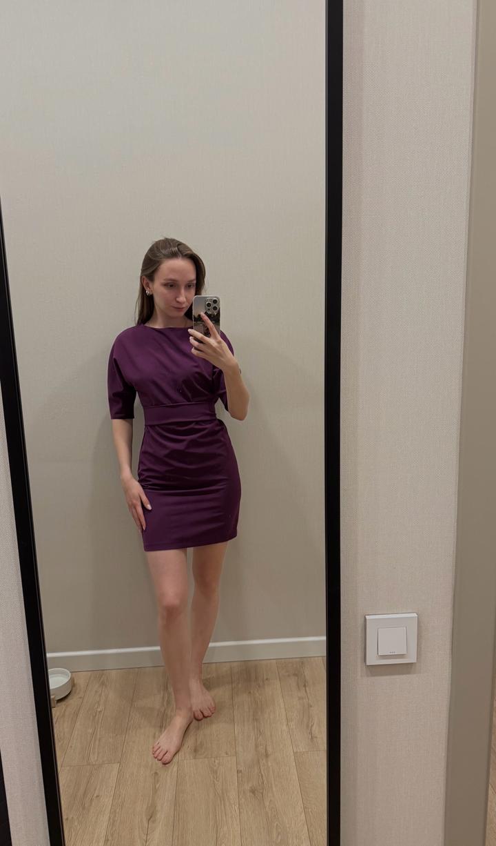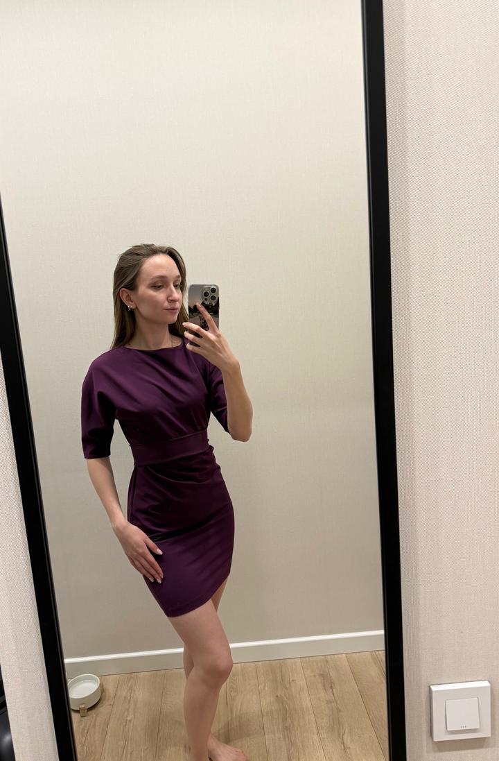 Короткое платье, которое выглядит скромно, благодаря закрытому верху. Надевала раза 2. Интересный баклажановый цвет! Артикул: 592029