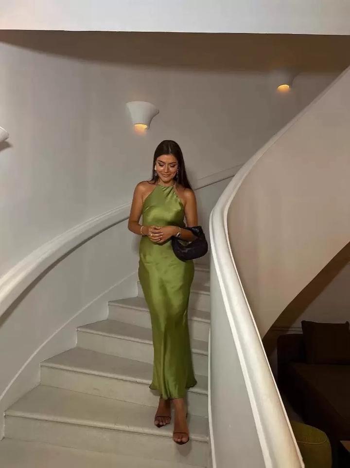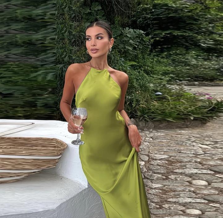 Изысканное длинное платье из гладкого сатина, которое подчёркивает силуэт и создаёт утончённый, женственный образ. Модель с халтер-воротом красиво открывает плечи и спину, добавляя образу лёгкости и элегантности. Благородный оливковый цвет смотрится дорого и стильно, идеально подходя как для вечерних мероприятий, так и для летних ужинов на свежем воздухе. Артикул: 592077