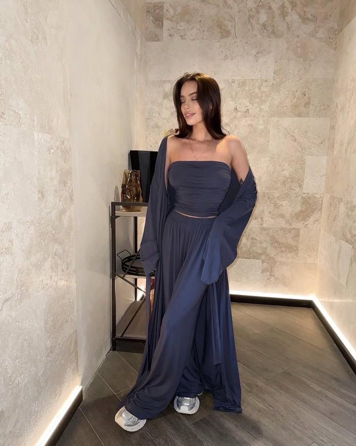 Летний костюм тройка, в синем цвете абсолютно новый, комплектация: 1 кардиган, 1 топ без бретелей, 1 брюки без карманов Артикул: 592395