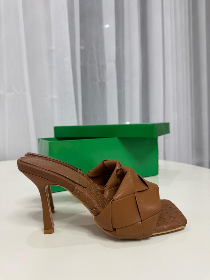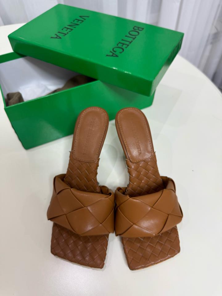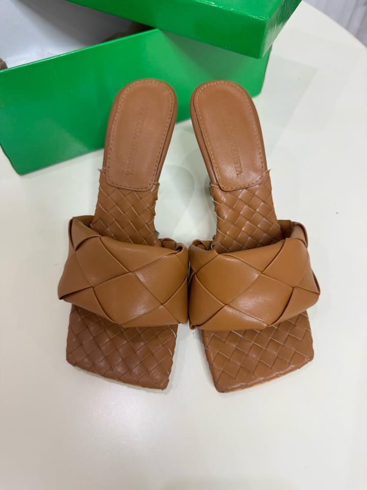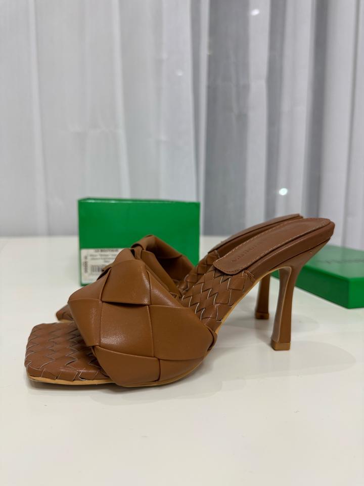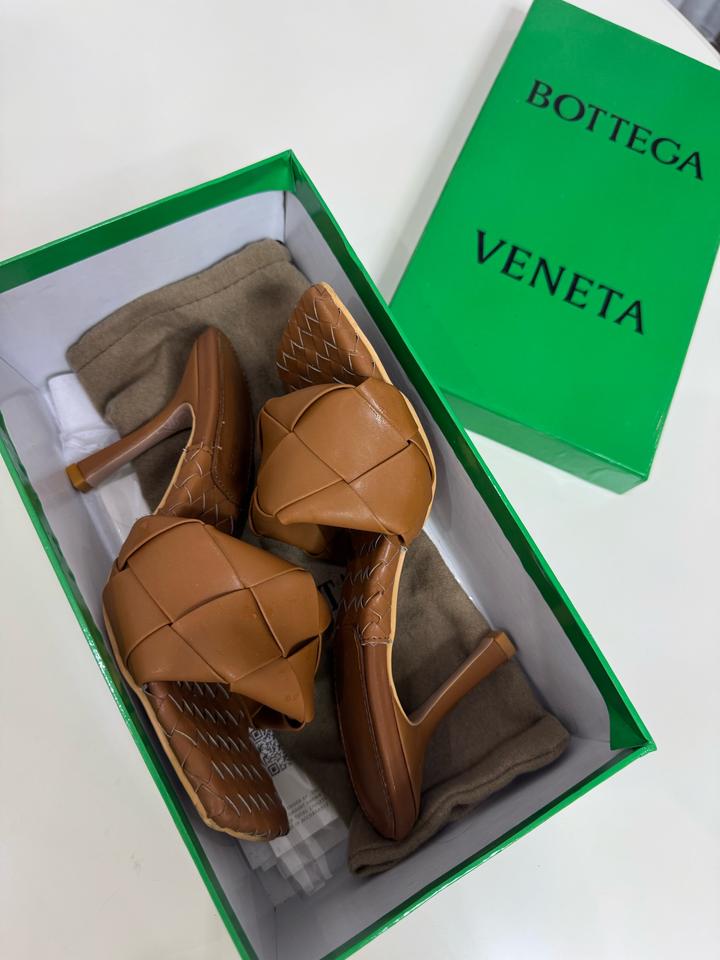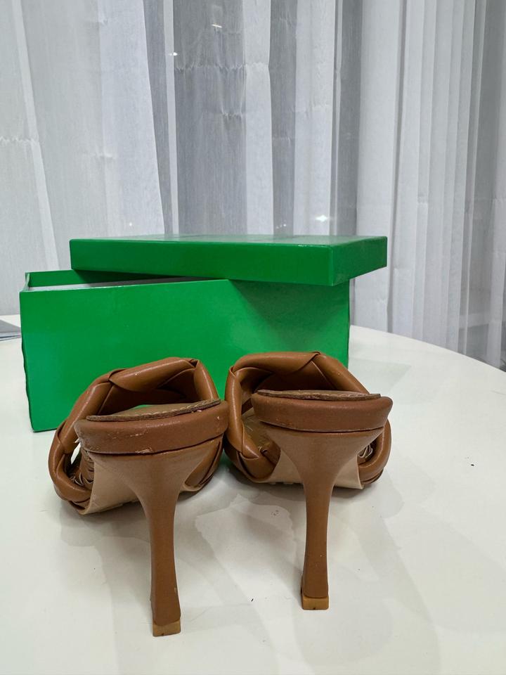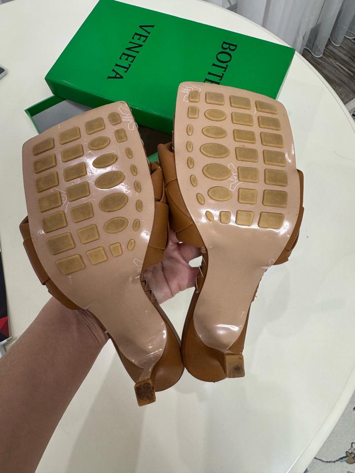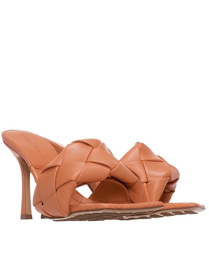 Сандалии Bottega Veneta цвета папайя, верх из плетёной кожи, квадратный носок, кожаная подошва, каблук-шпилька, строчка в тон. Очень удобная Артикул: 592437