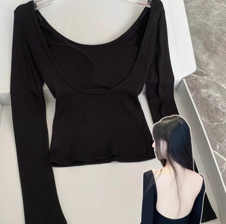 Кофта черного цвета с открытой спиной, есть вставки лифа и тонкие силиконовые полоски на плечиках чтобы не спадали рукава. Артикул: 592537