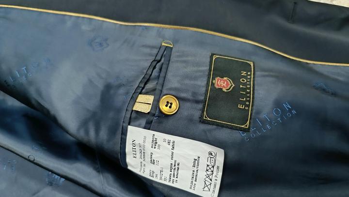 Eliton темно синий пиджак. На высокий рост( около 190 см) . Размер 54-56. Верх: 98% шерсть, 2% эластан. Подкладка: 100% вискоза Артикул: 592551