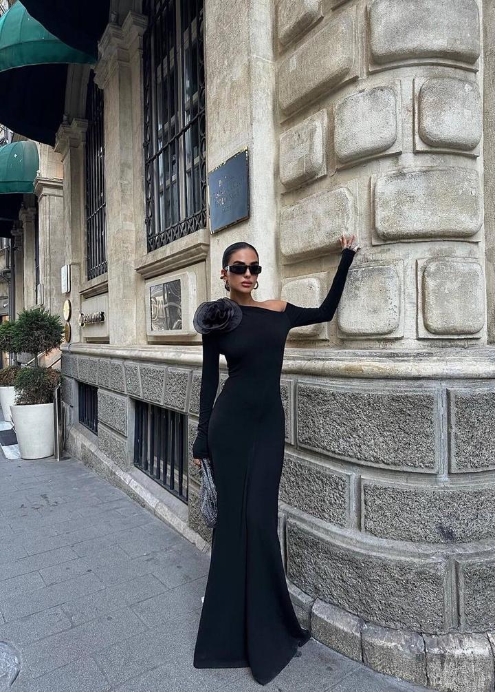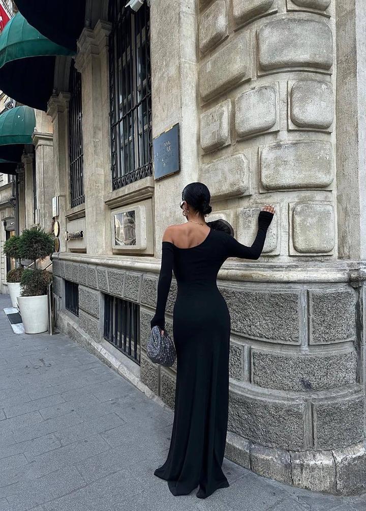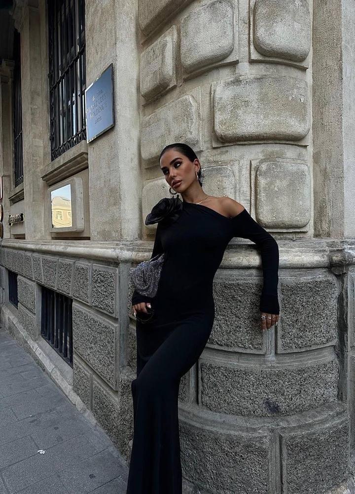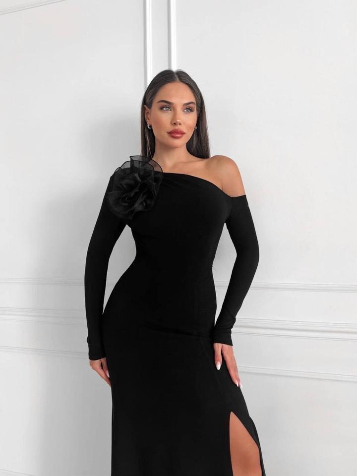 Черное платье макси на одно плечо со съемной розойM