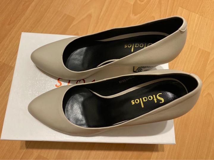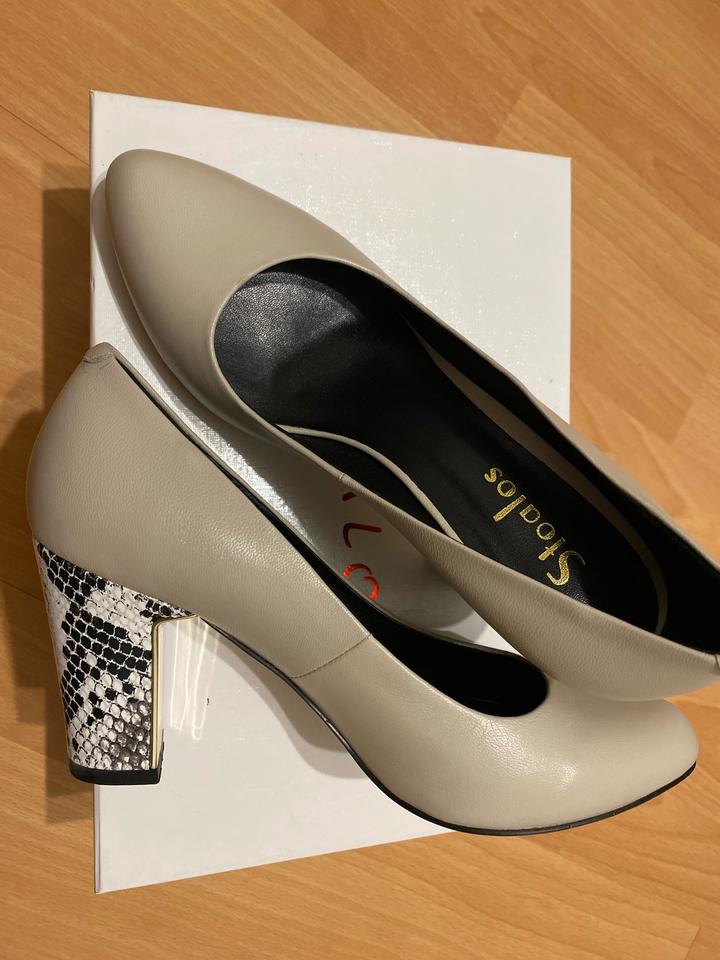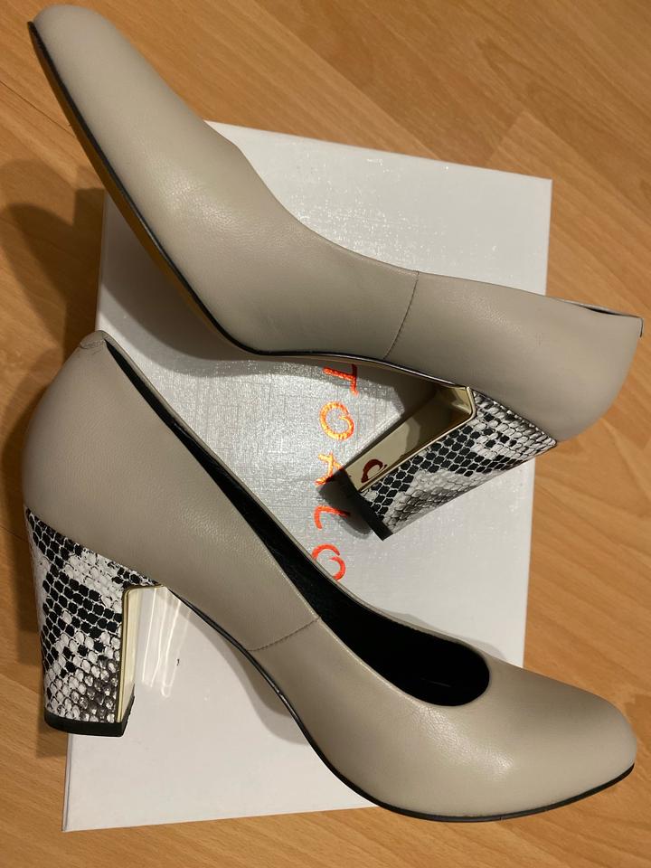 Туфли из натуральной кожи Stoalos, светло-серого оттенка. Акцентный каблук со змеиным принтом, устойчивый (8см). Новые туфли, на подошве следы от примерок при приобретении. Подойдут к однотонным и мультиколор-вещам. Артикул: 592568