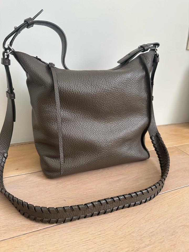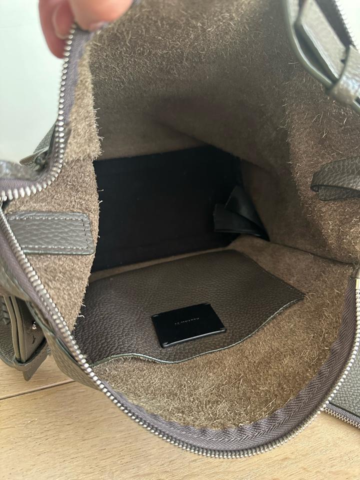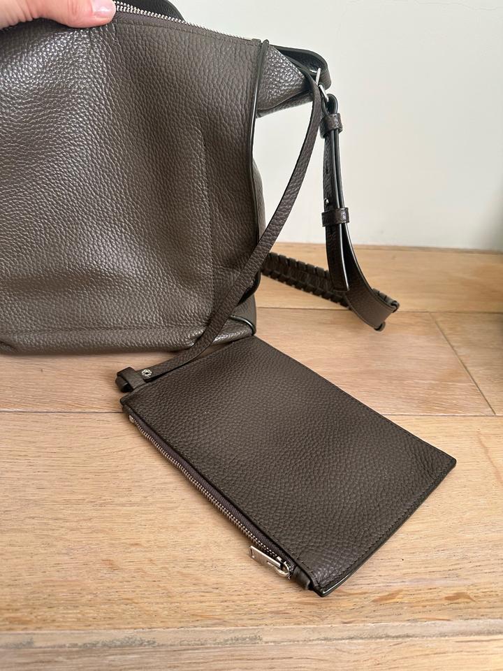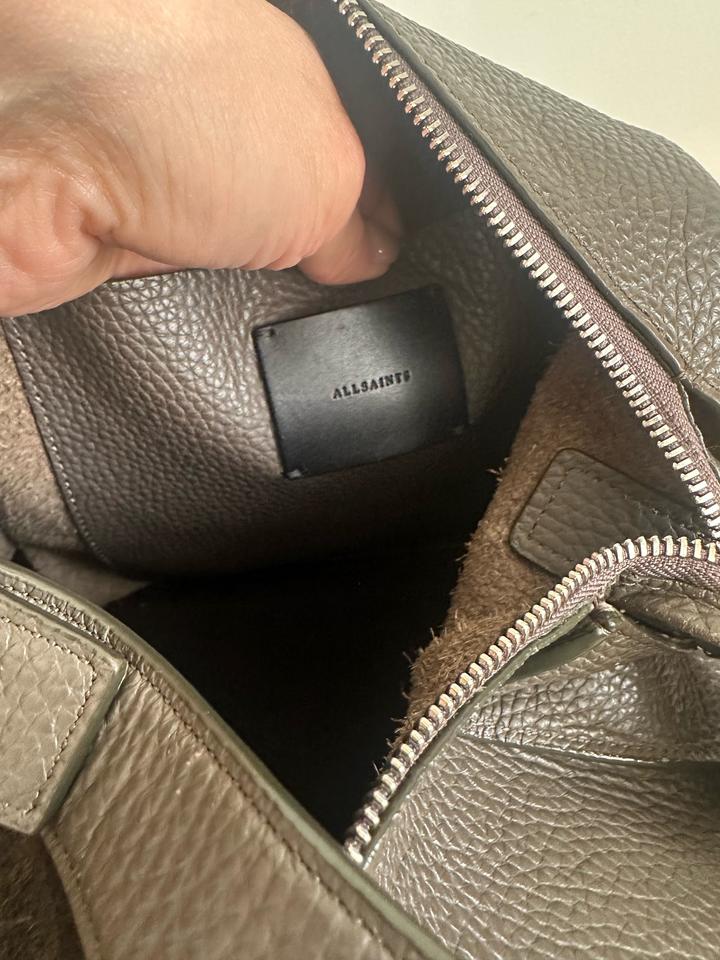 Кожаная сумка AllSaints, цвет темный тауп, 2 отстегивающиеся и регулируемые ручки, внутри один карман и мини клатч на ремне. Имеет следы потертости Артикул: 592849