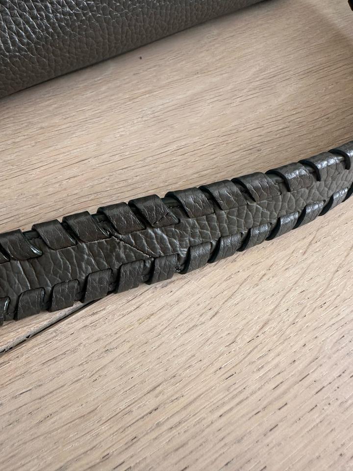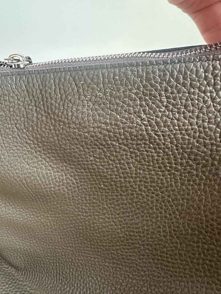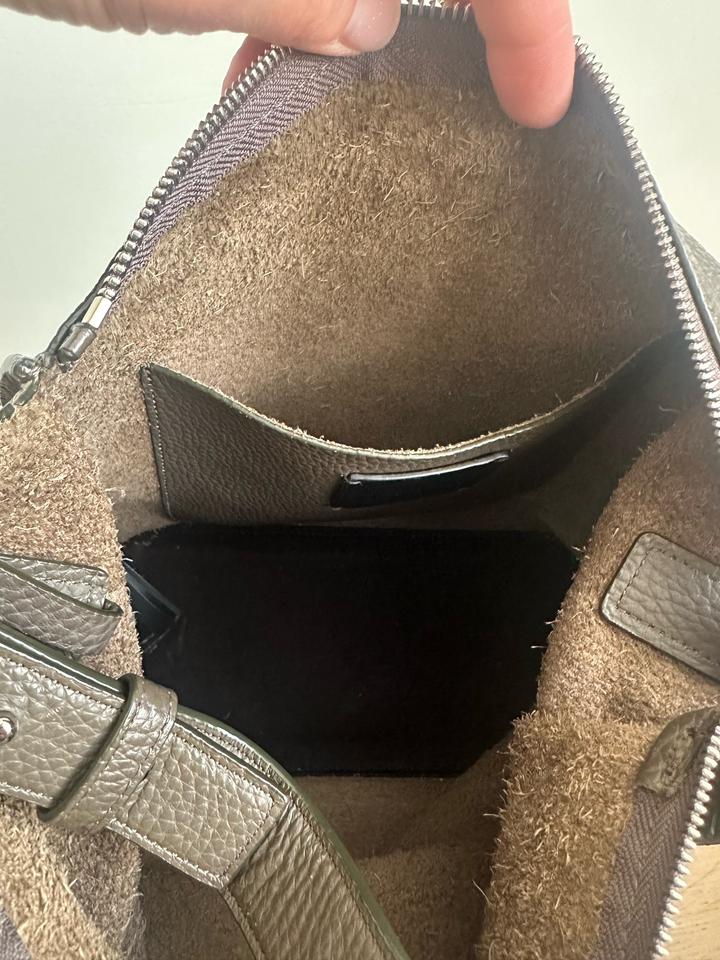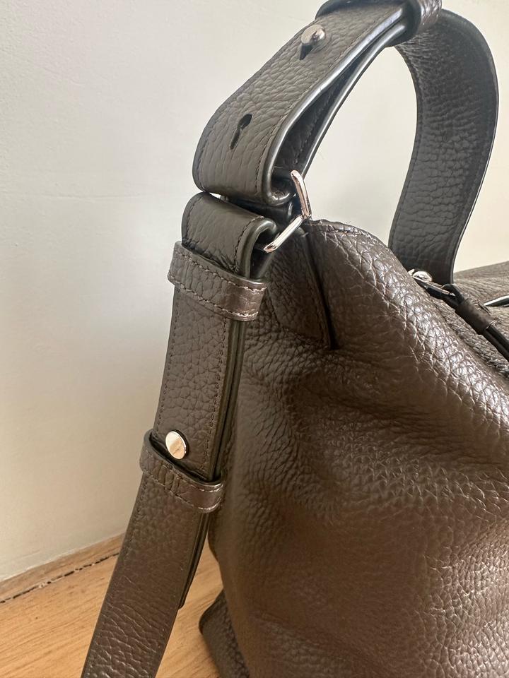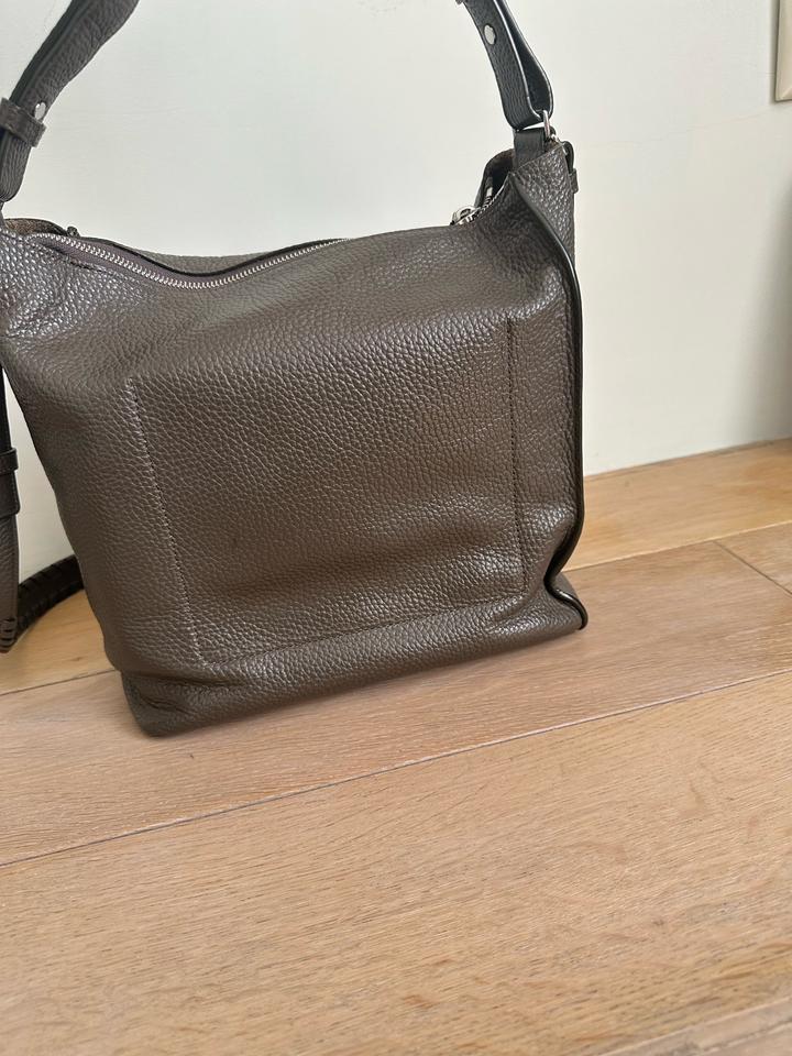 Кожаная сумка AllSaints, цвет темный тауп, 2 отстегивающиеся и регулируемые ручки, внутри один карман и мини клатч на ремне. Имеет следы потертости Артикул: 592849