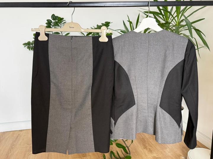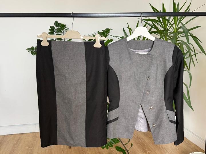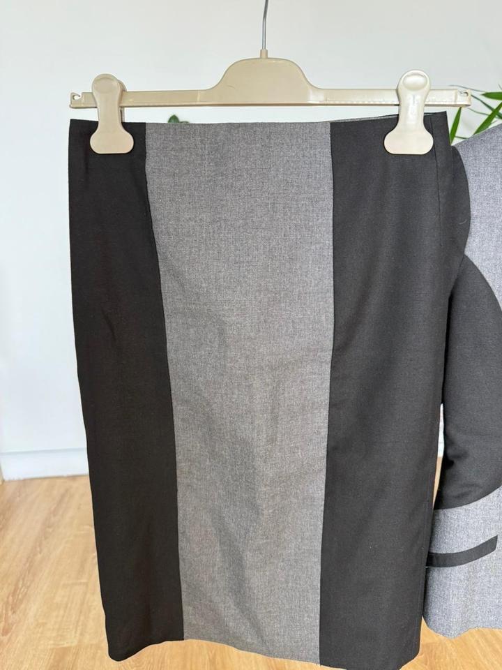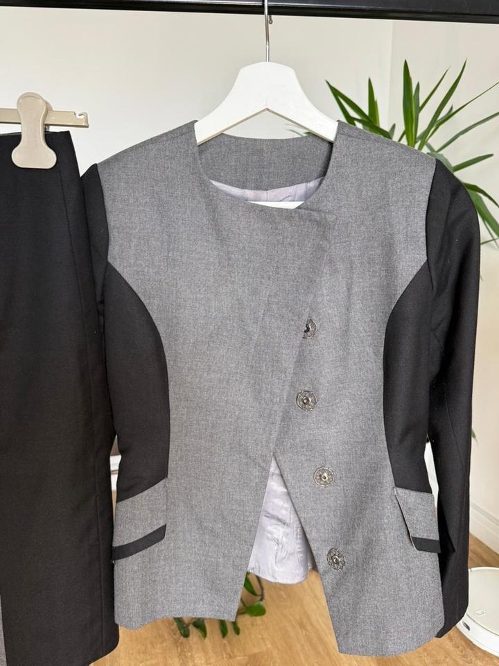 авторский костюм из тонкой шерсти в двухцветном решении: серый + чёрный. Жакет без воротника с чёрными рукавами, декоративными серебряными пуговицами и фигурными карманами. Юбка-карандаш в тон с вертикальными цветными блоками. Геометричный крой и продуманные детали делают этот костюм настоящей находкой для ценителей уникальных вещей. Артикул: 592884