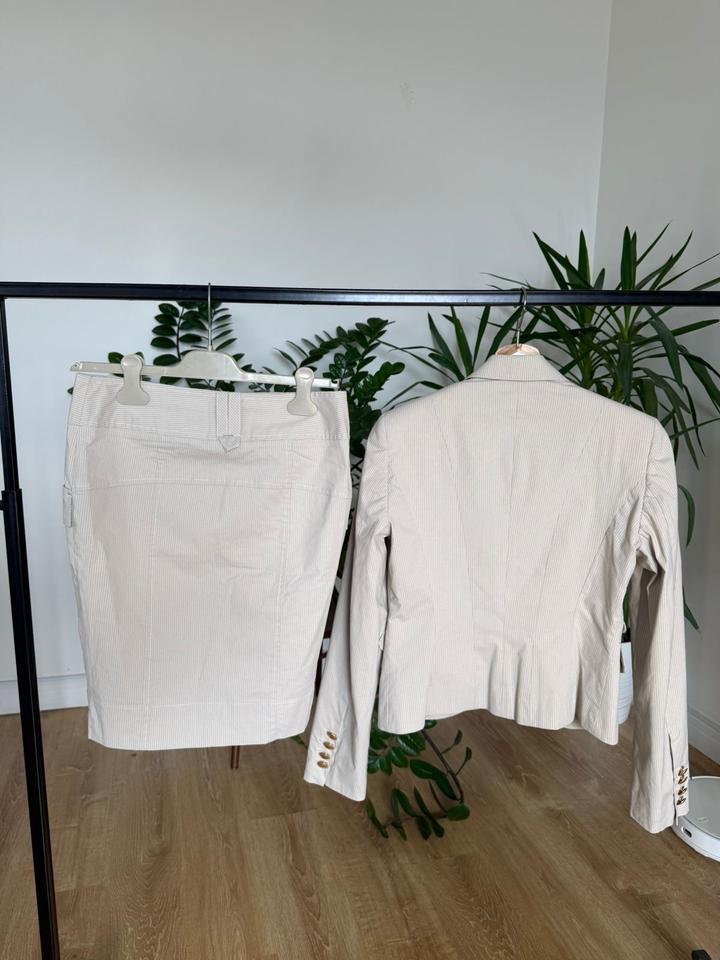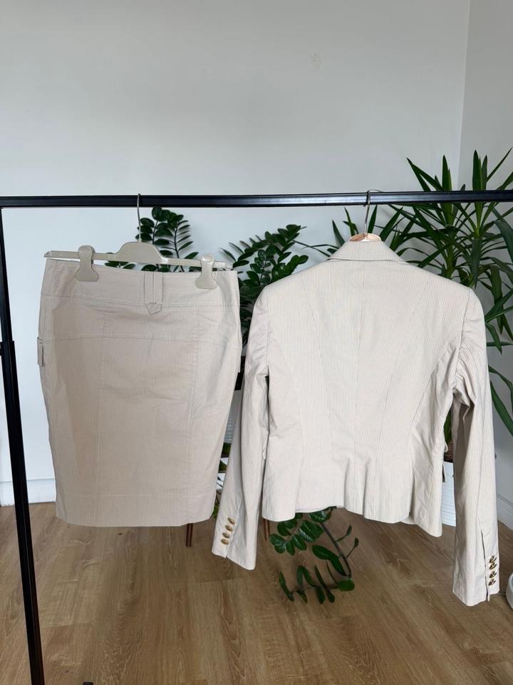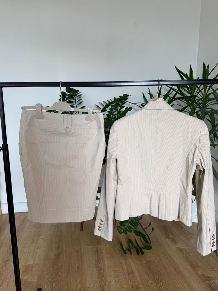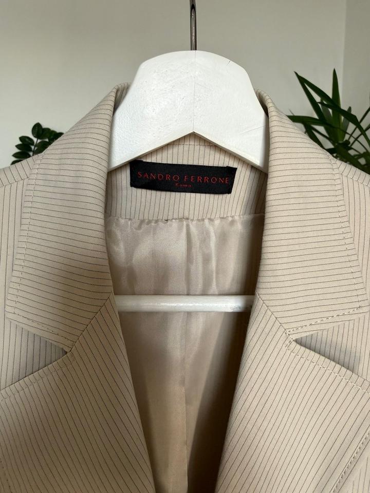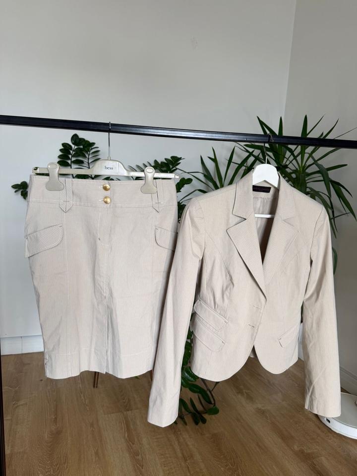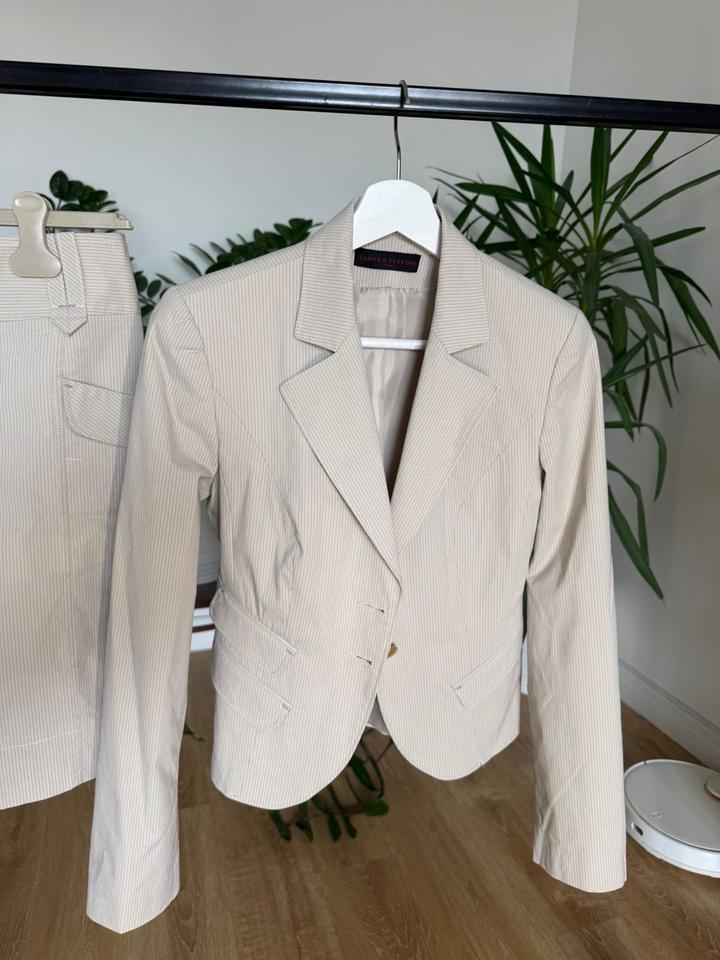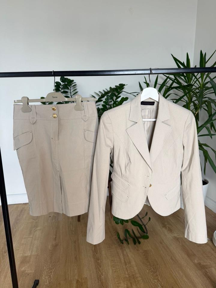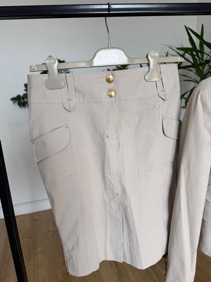Бежевый костюм в тонкую полоску от итальянского бренда Sandro Ferrone Roma. Приталенный жакет с острыми лацканами и золотыми пуговицами, юбка-карандаш с накладными карманами в тон. Элегантное сочетание классики и итальянского шика — идеально для офиса или деловой встречи Артикул: 592895
