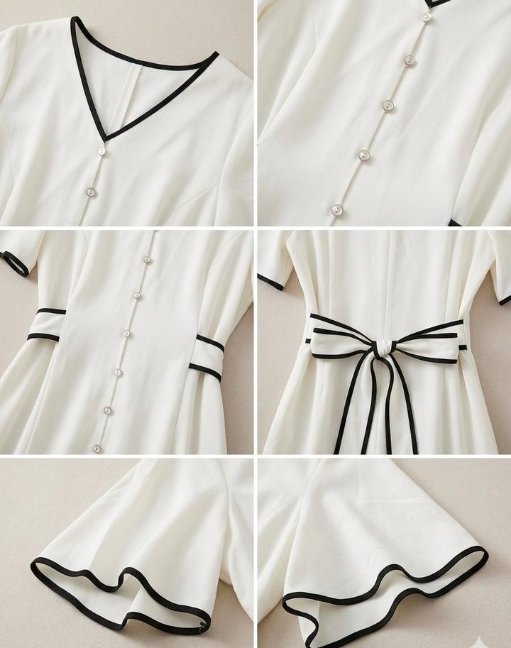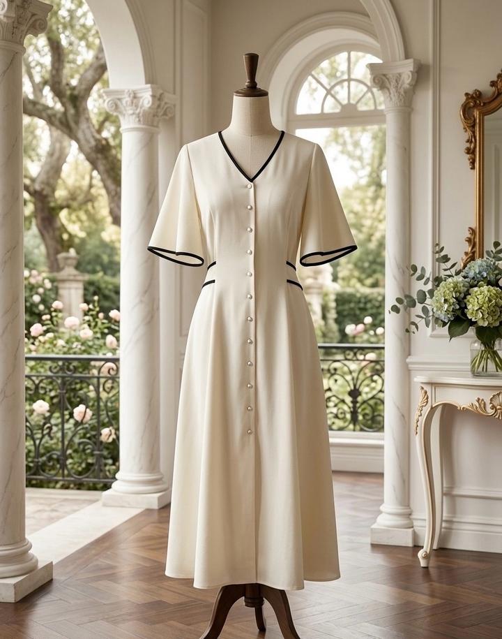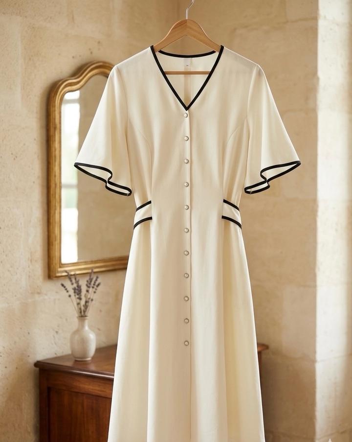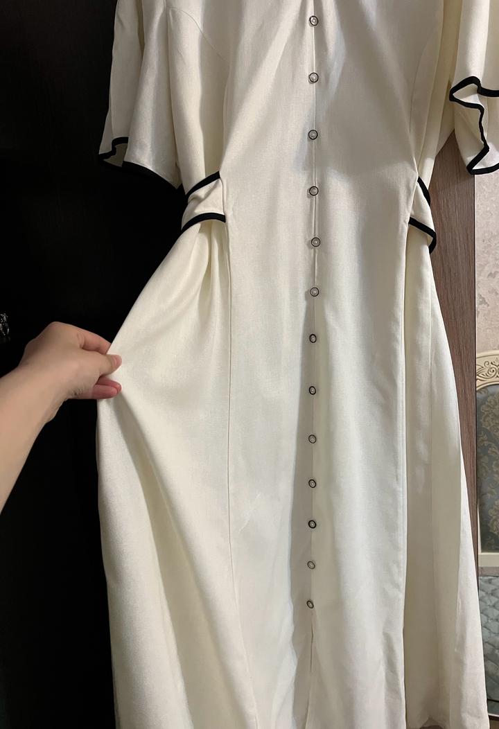 Это платье — воплощение женственности и стиля «тихая роскошь». Контрастный черный кант подчеркивает линии силуэта, а ряд пуговиц визуально вытягивает фигуру.Состояние: Идеальное, вещь прошла предпродажную подготовку (отпарена Артикул: 593036