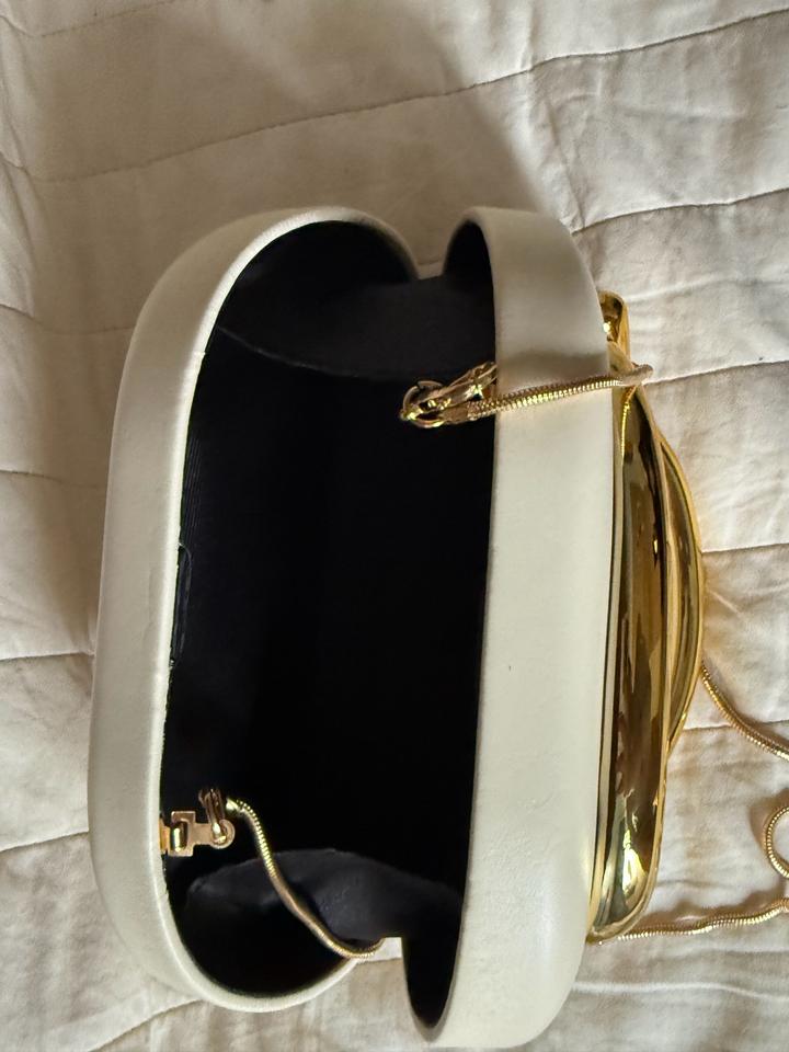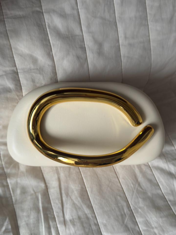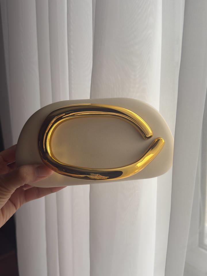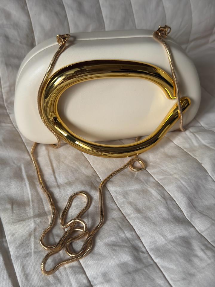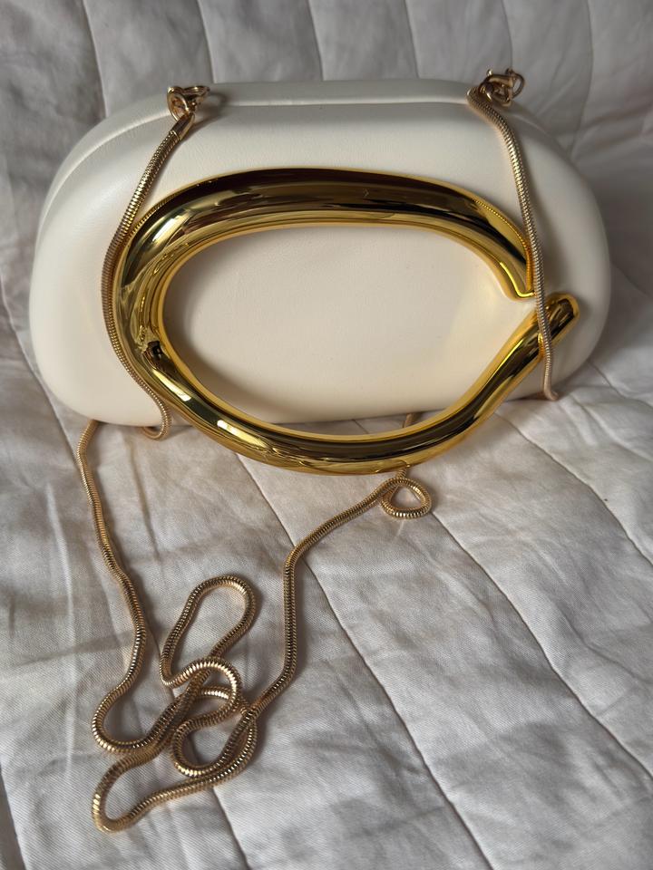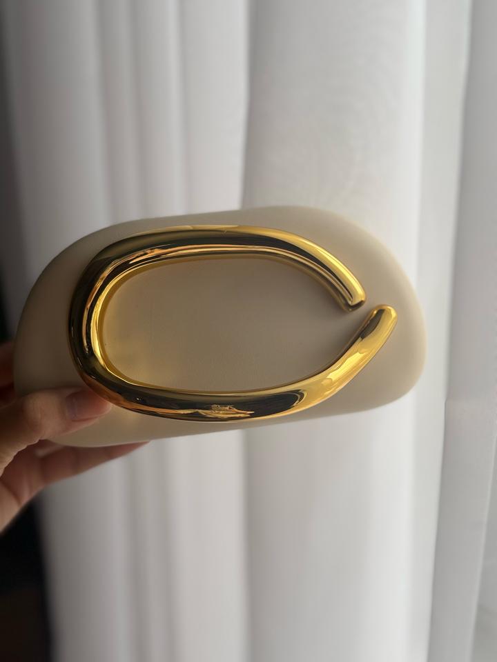 Элегантная мини-сумка в современном скульптурном стиле. Модель выполнена из гладкой экокожи молочного/кремового оттенка и дополнена эффектной массивной ручкой-дугой из глянцевого металла золотого цвета. Длинная цепочка-ремешок позволяет носить сумку на плече или через плечо. Форма — мягкий прямоугольник с округлёнными краями, выглядит минималистично и очень трендово. Такая сумка станет акцентным аксессуаром для вечерних образов, праздничных выходов и стильных повседневных луков. ✨ Артикул: 593152