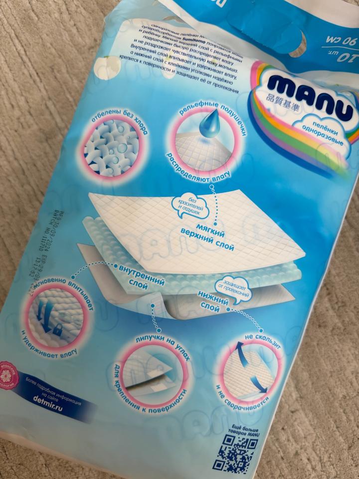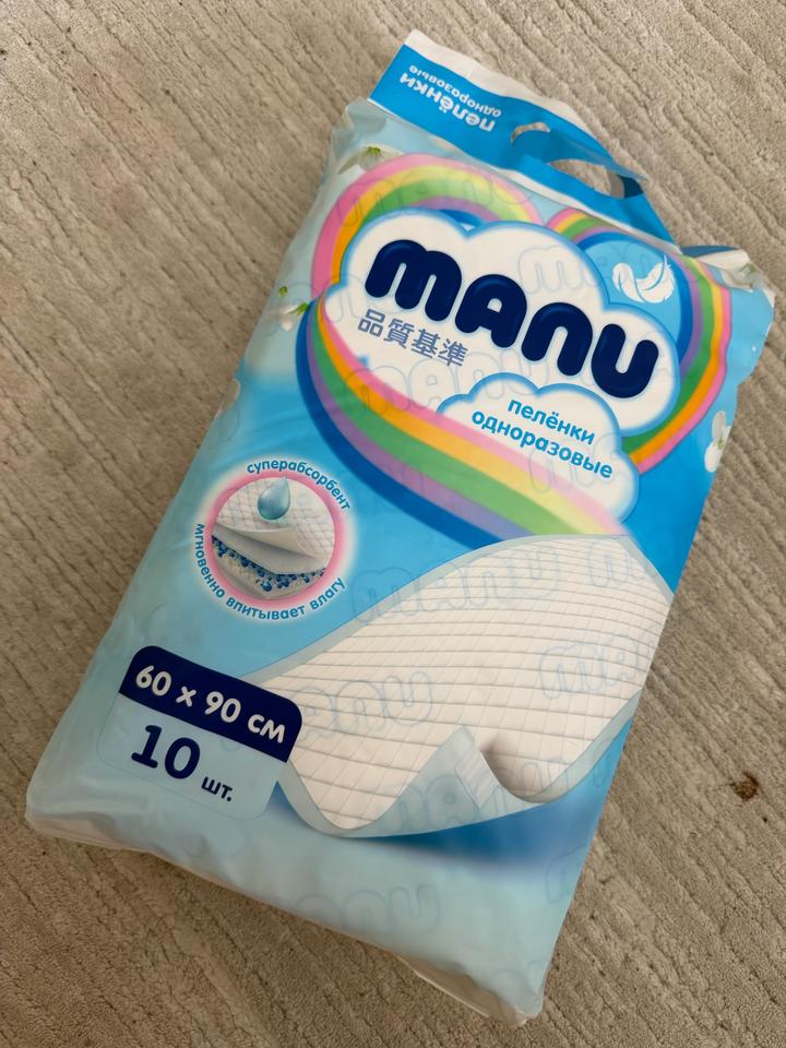 Новая упаковка одноразовых пеленек от бренда Manu размером 60х90. Удобно использовать для малышей чтоб отдохнуть от памперсов, про получении массажа и прочее. Артикул: 593176